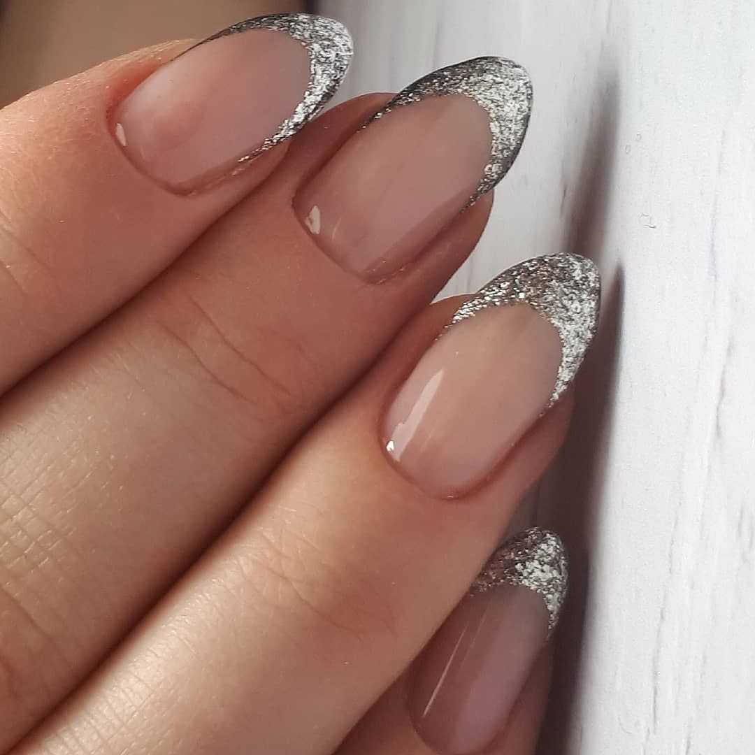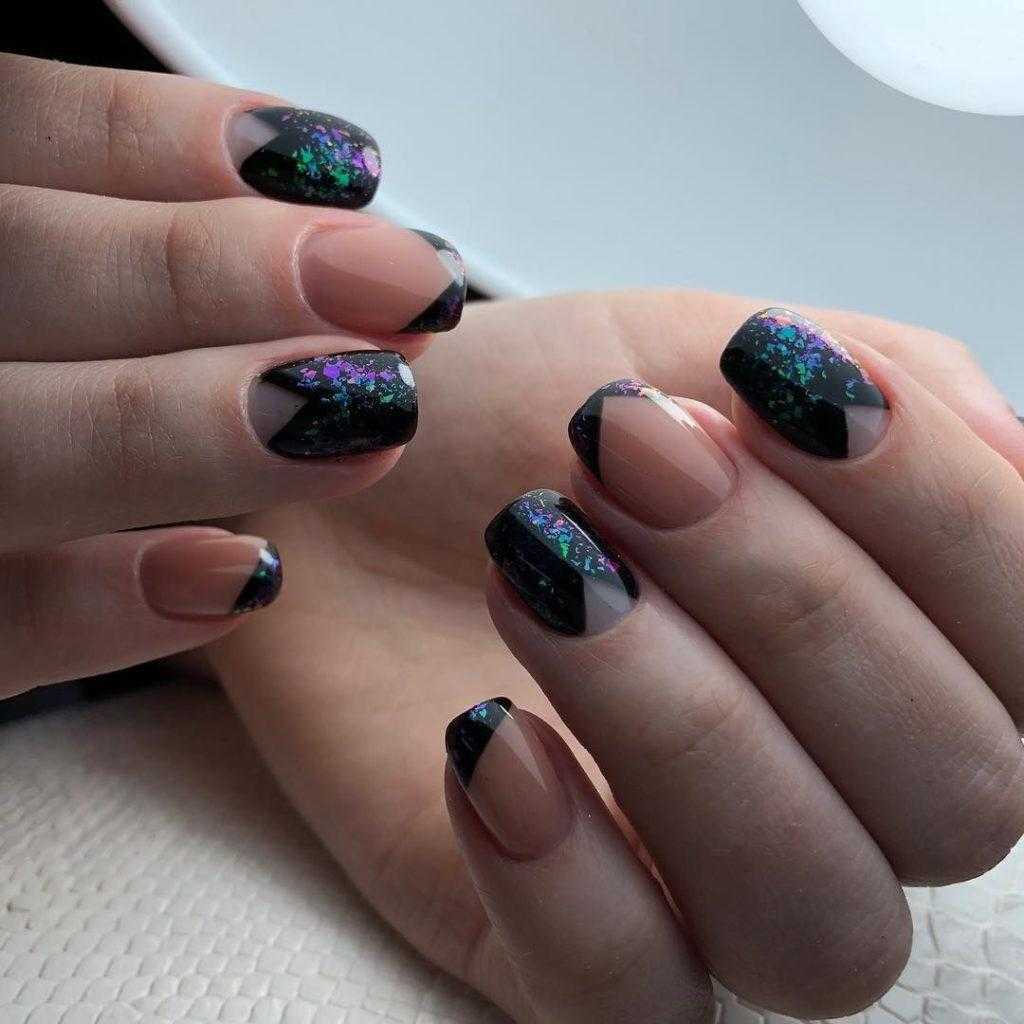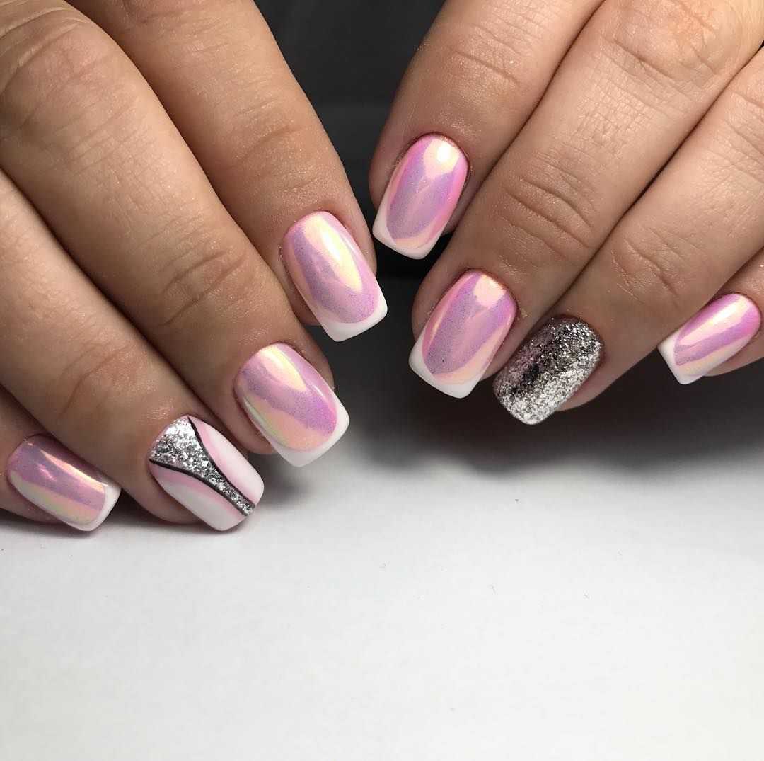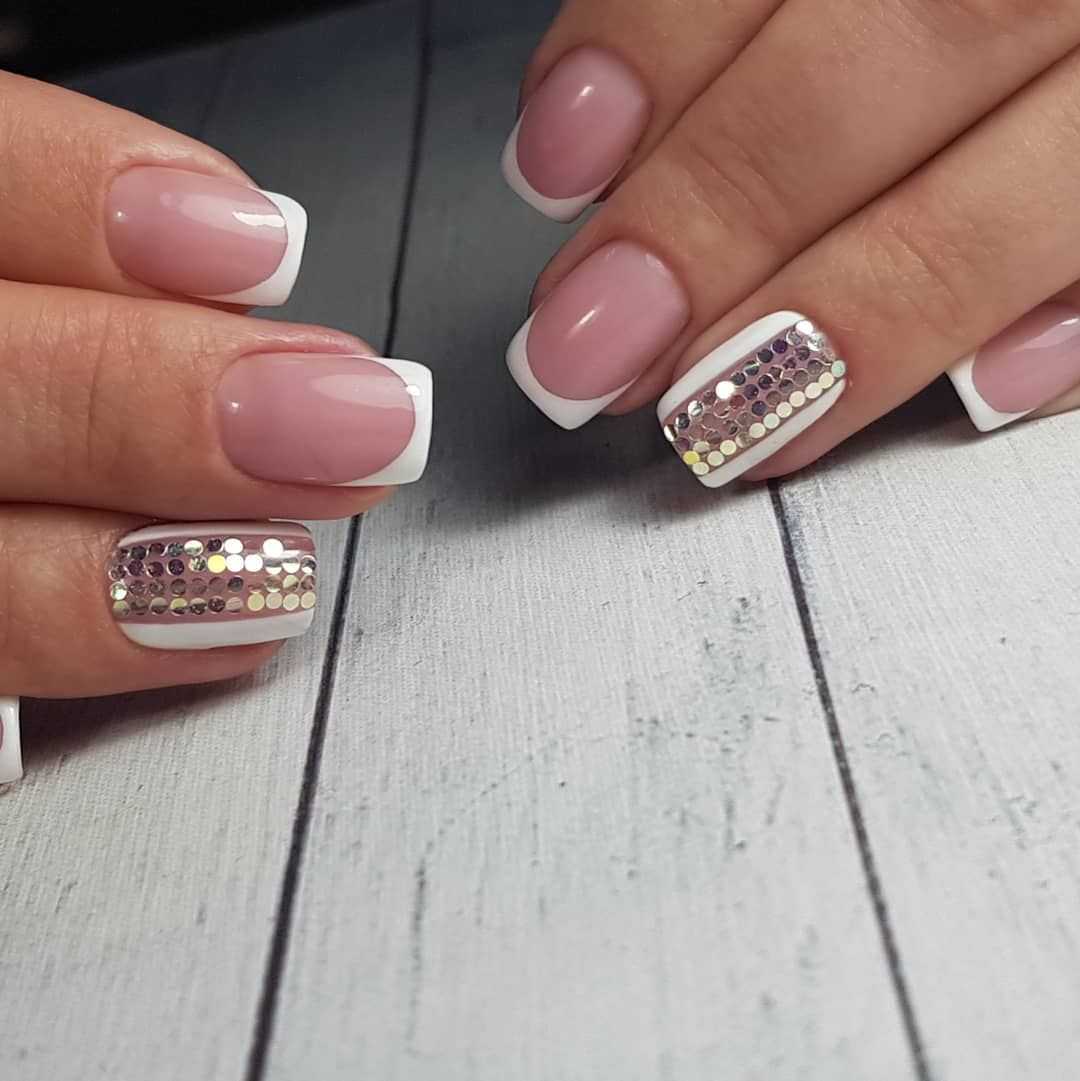 - френч с блестками — сияющие частицы можно заложить в основу или в финишное покрытие.