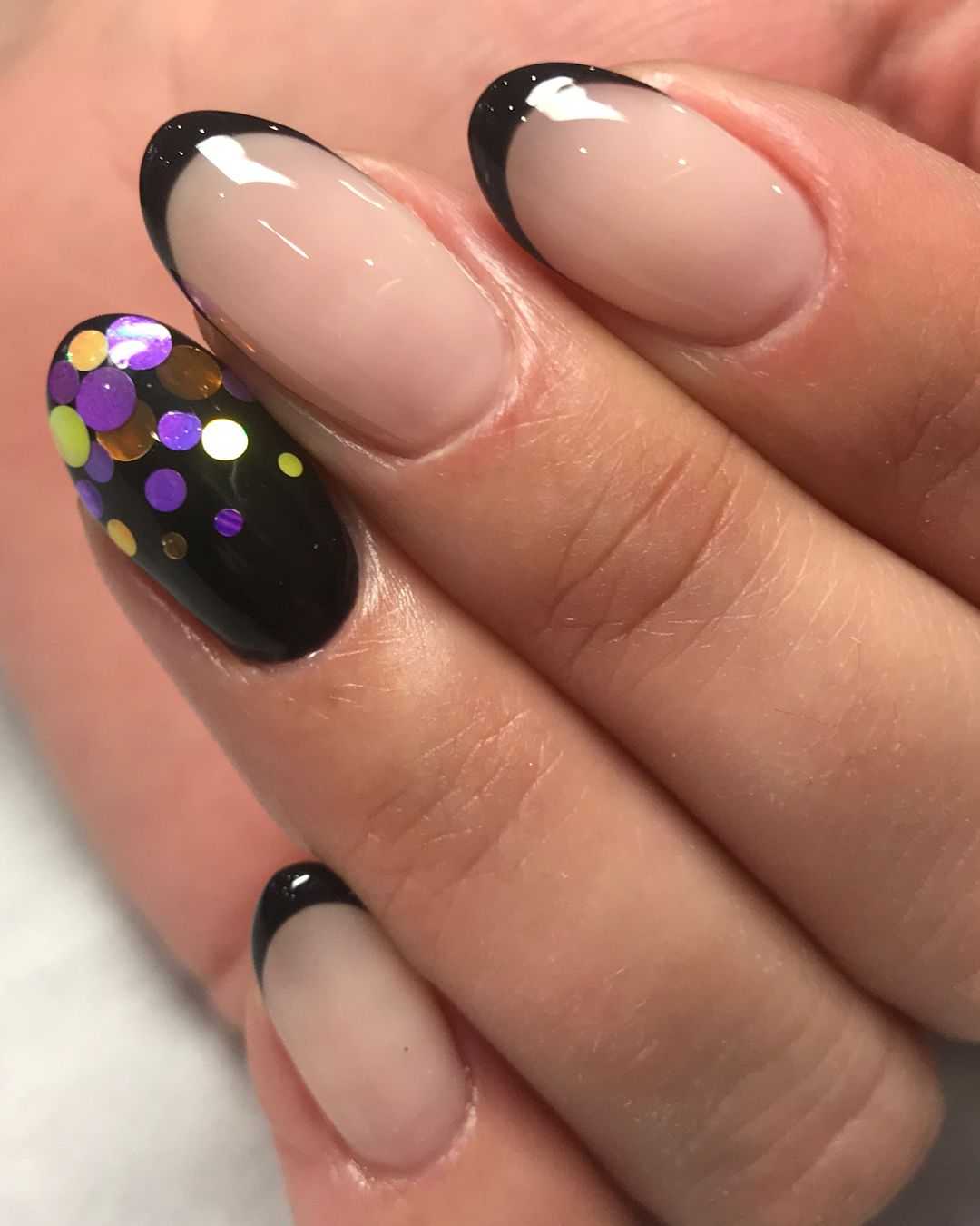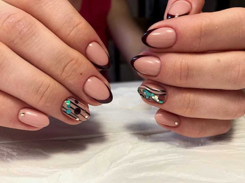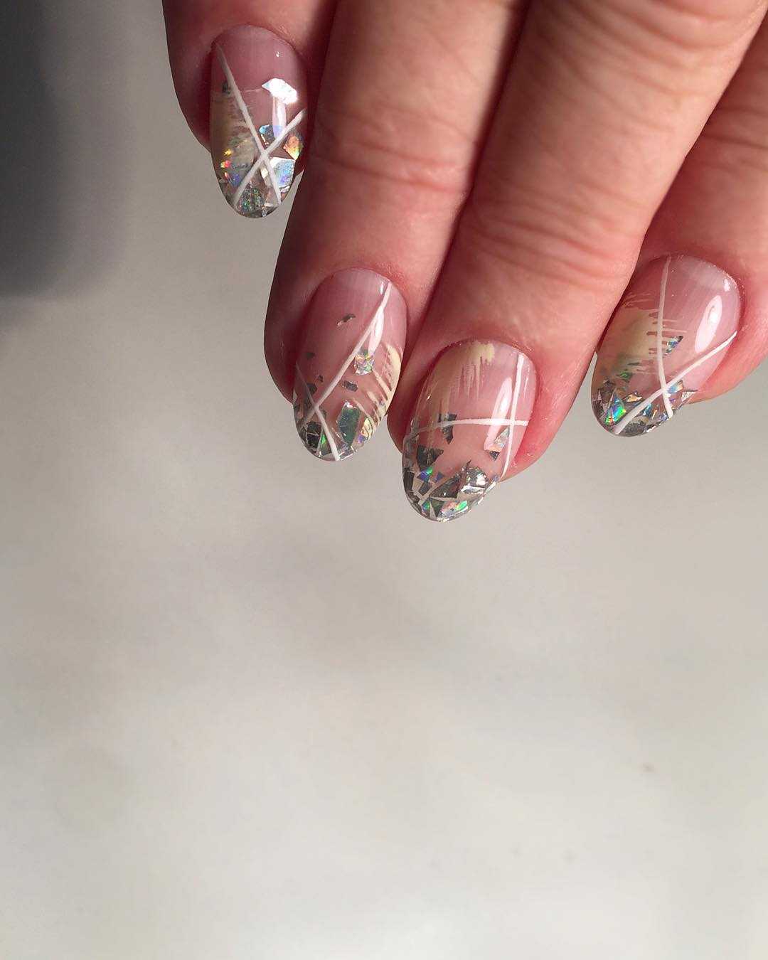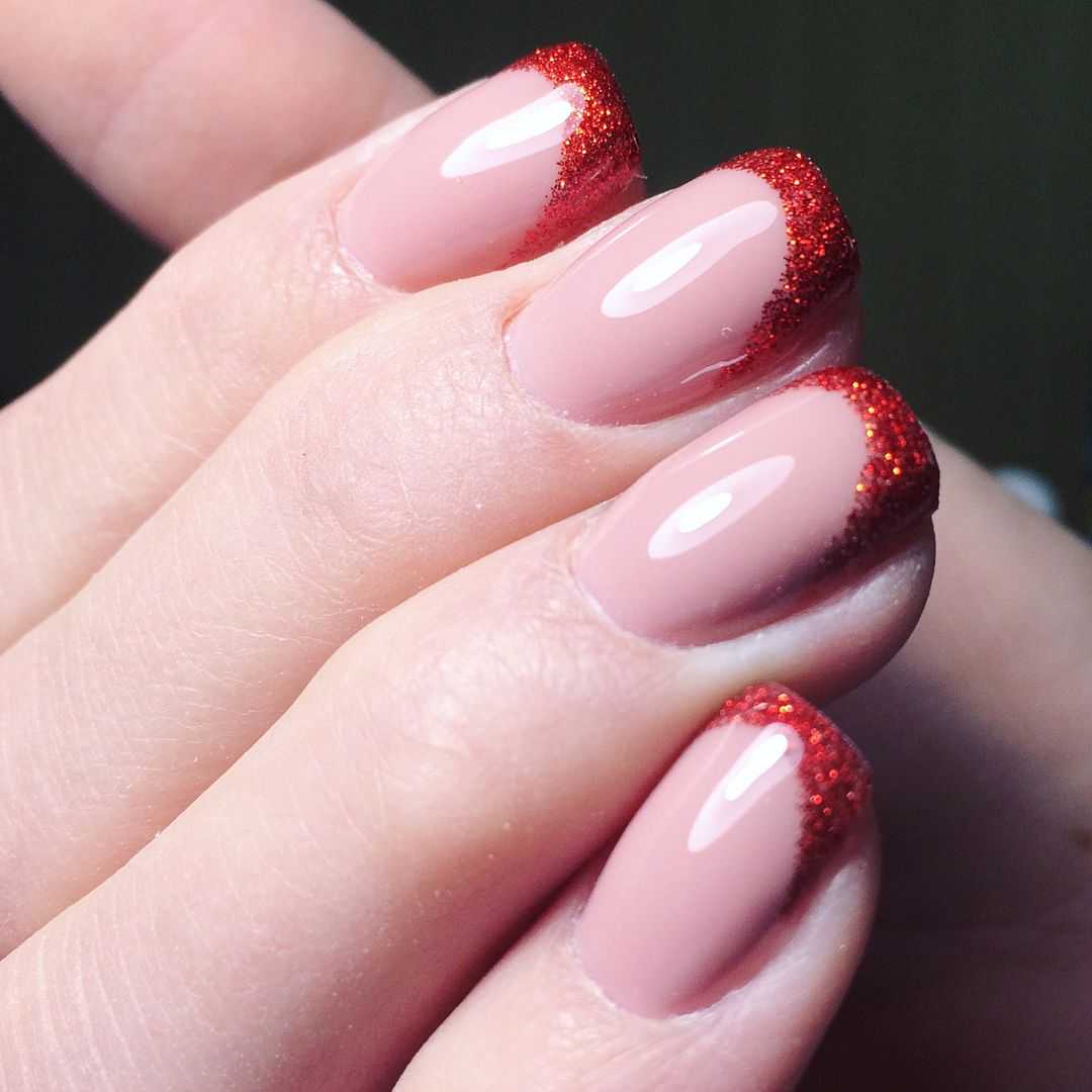 - френч с блестками — сияющие частицы можно заложить в основу или в финишное покрытие.