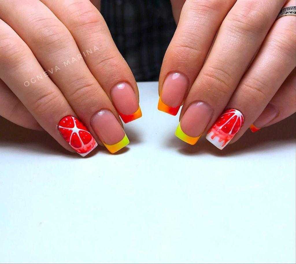 Пожалуй, один из самых модных видом дизайна на лето – френч с фруктово-ягодным рисунком. Это прекрасный вариант для жарких будней, поездок и отпуска. Чаще всего его делают на ноготках средней длины, что позволяет реализовать любую задумку.