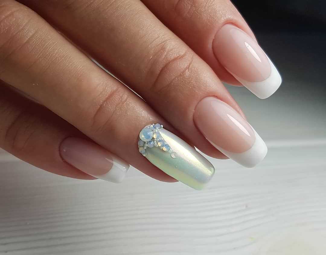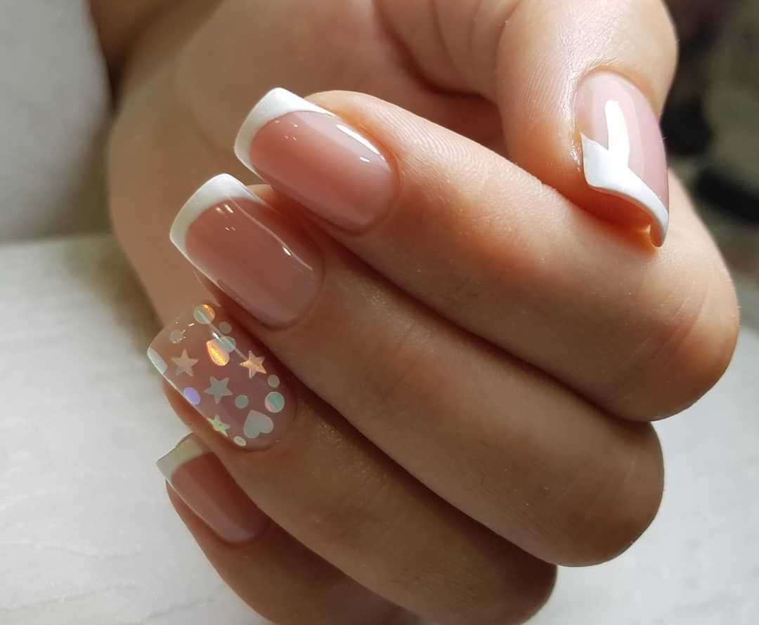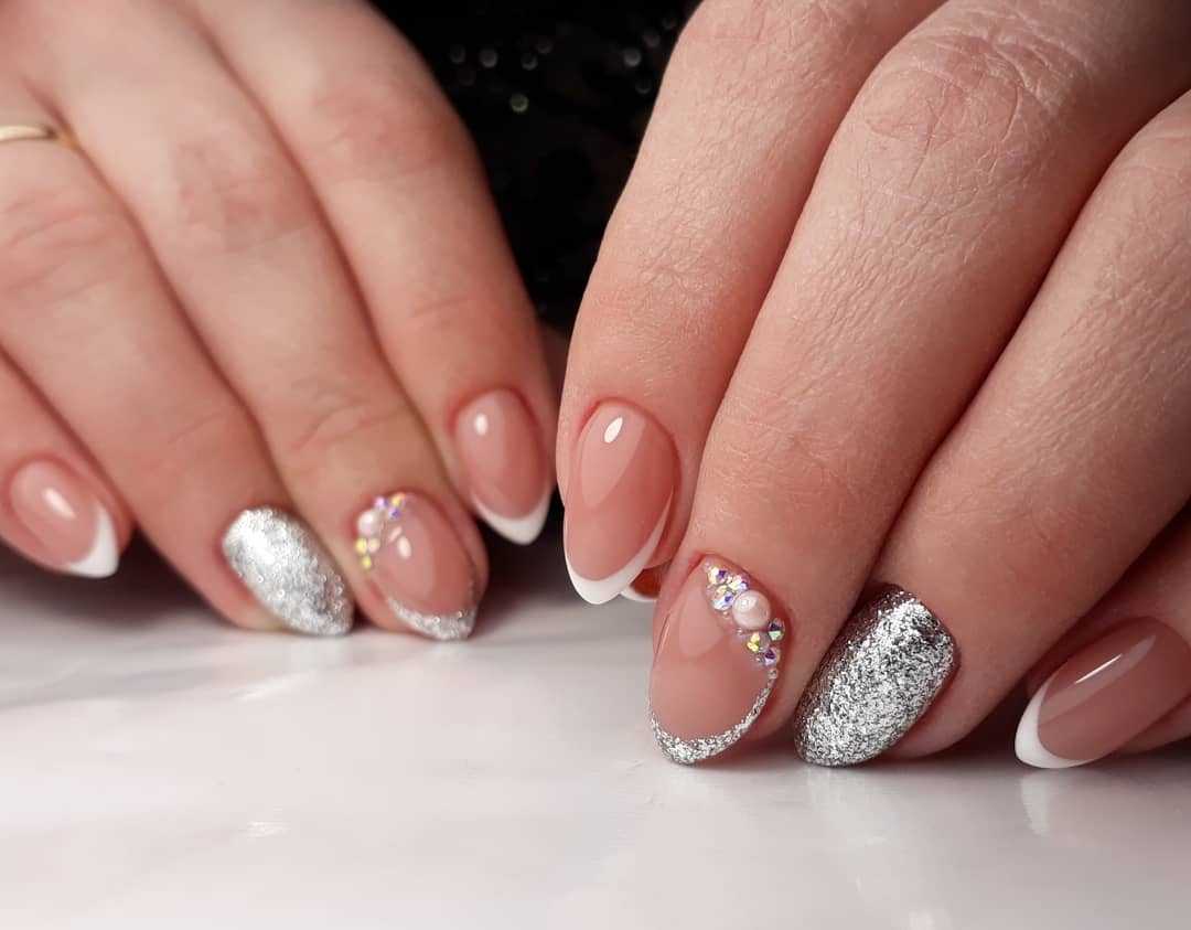 Френч — очень непритязательный вид маникюра. Он не диктует строгих правил для разной длины и формы ногтей. Но дополнительный декор в виде блесток заставляет задуматься над тем, где именно расположить и как оформить дизайн.