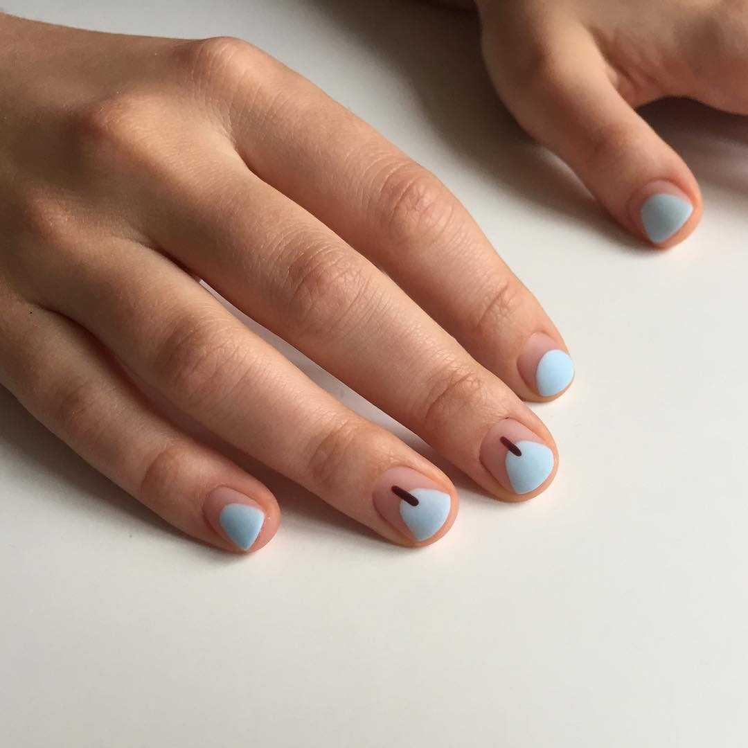 - сочетание френча и геометрии — дизайн может быть исполнен в нескольких вариантах (геометрические узоры на 1-2 ногтях, френч и геометрия на 2-4 ногтевых пластинах и пр.);