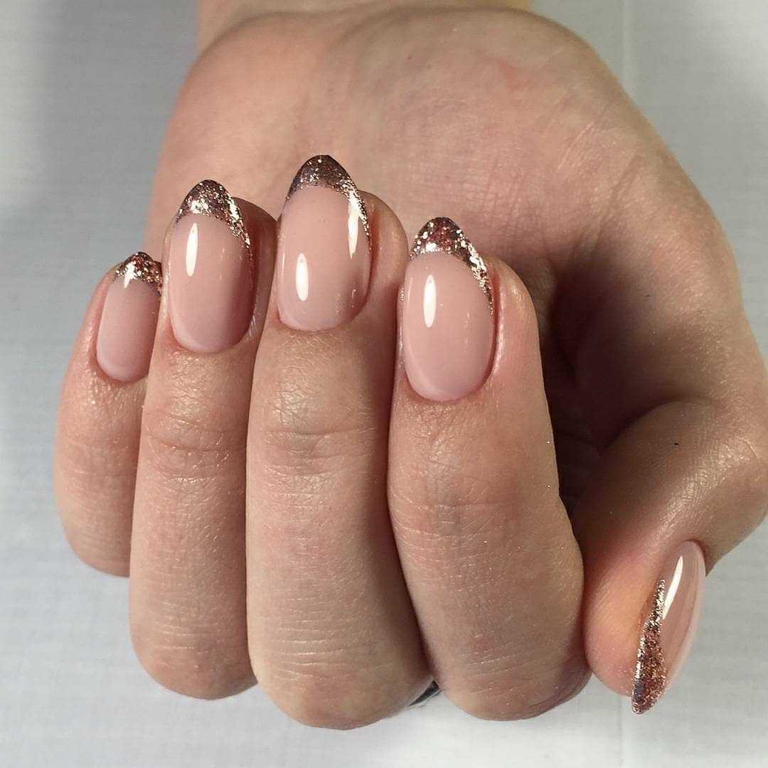 Миндальная форма универсальна и женственна. Не стоит выбирать слишком резких и четких линий. Лучше выбирать округлые формы кончика ногтя.Другие варианты декора — вертикальные полоски блестками, оформление одного двух ногтей или лунок.