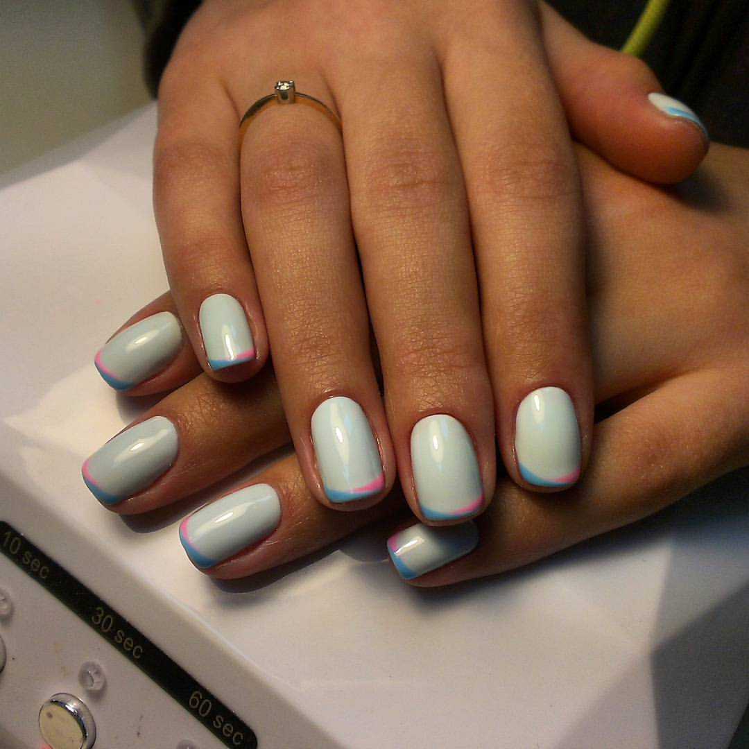 С осторожностью для такого французского маникюра нужно выбирать и форму каймы — асимметрия и угловые варианты могут как вытянуть пластину, так и сделать ее короткой и широкой. Предпочтительнее классический вариант французского маникюра