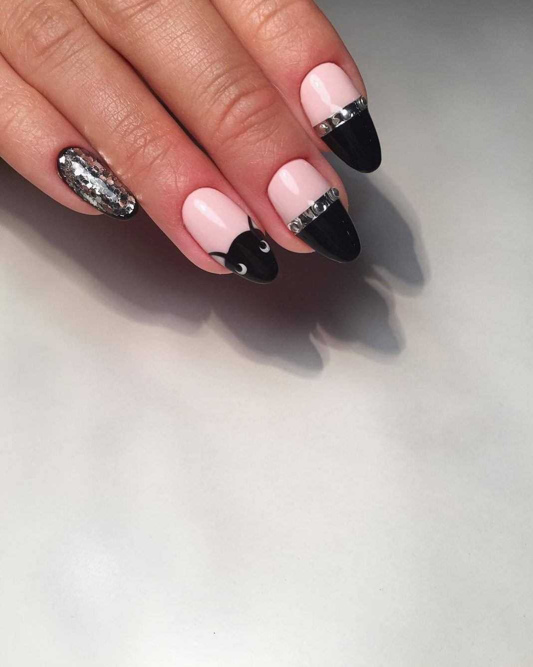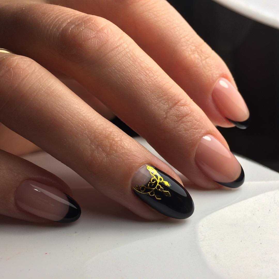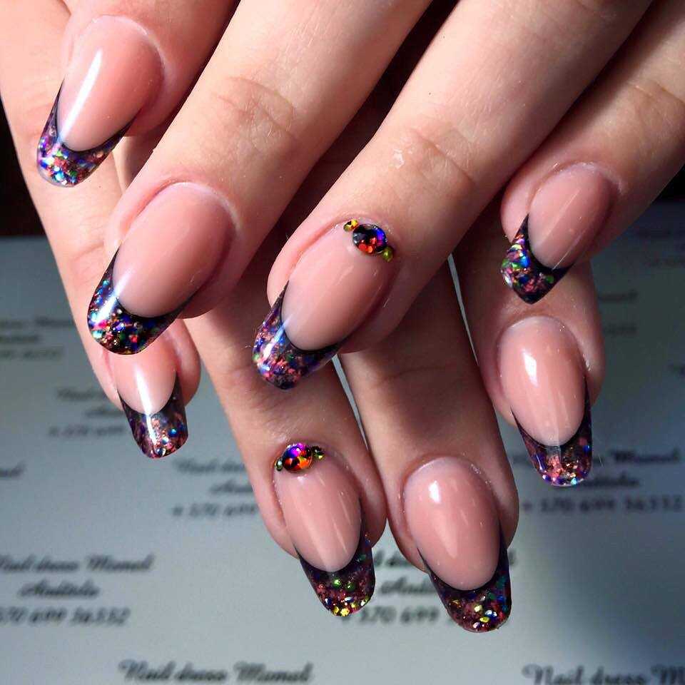 • декор со стразами – разделённая серединной выкладкой из белых камней на чёрном фоне, усеянная в диагональной плоскости поверхность ногтевой пластины или вообще полностью покрытое стразами ногтевое ложе – в любой манере расположения разнокалиберных светлых камней на тёмном фоне подобный миндальный маникюр будет смотреться просто блестяще. Здесь можно играть с цветами и менять, например, основу с тёмной на светлую, а стразы при этом с белых на чёрные. Эффект в любом случае будет потрясающим;• битое стекло – ещё один будоражащий сознание маникюр, завораживающий магическим мерцанием имитированных осколков серебряного или золотого стекла из фольги на глянцевом чёрном базовом покрытии;• парчовый френч – удивительная тенденция к оформлению объёмной росписи на матовой поверхности миндалевидных ноготков в дорогих аристократических расцветках смотрится особенно нарядно. Обрамлённая выпуклыми парчовыми вензелями улыбка французского маникюра выглядит довольно презентабельно и буржуазно.