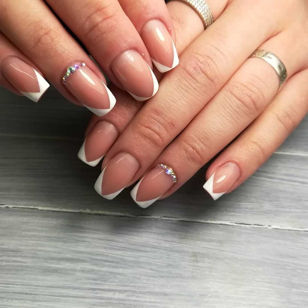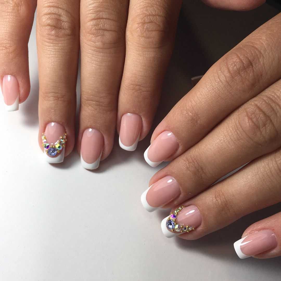 Остается популярным традиционный классический френч без украшений и декорирования. Стандартная форма улыбки, нюдовая сторона и белый краешек ногтя.