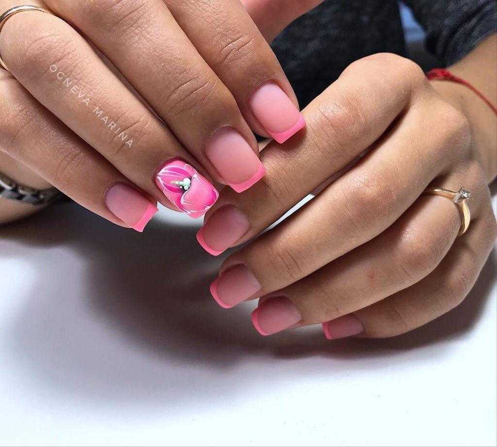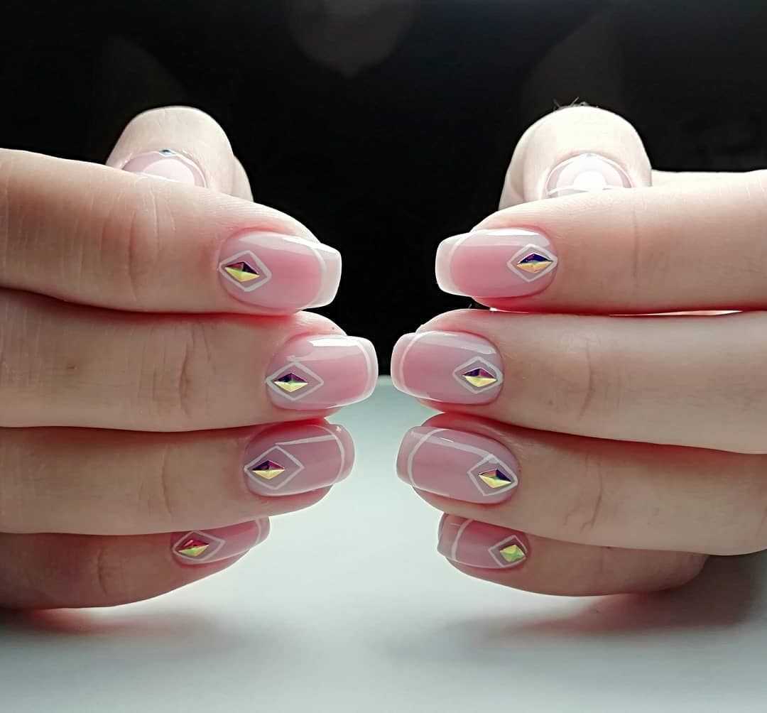 Розовые оттенки всегда будут оставаться нежным и женственным вариантом маникюра. Краешки ногтевых пластин могут быть разноформенными, в виде абстракции, геометрических фигур, сердечек.