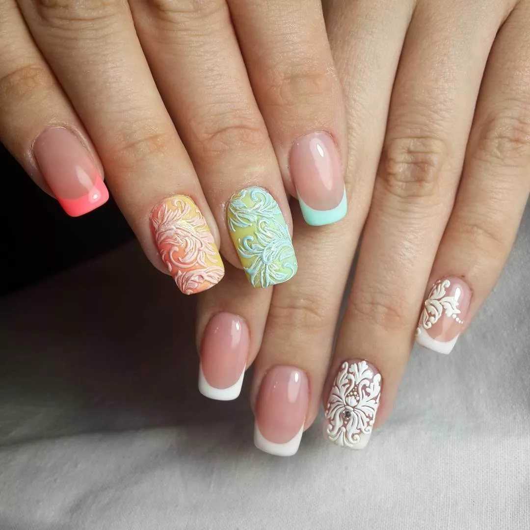 Разноцветный френч на коротком миндале может выглядеть нелепо и вульгарно. В предстоящих сезонах на такой форме не следует делать маникюр с использованием более 3 оттенков гель-лака.