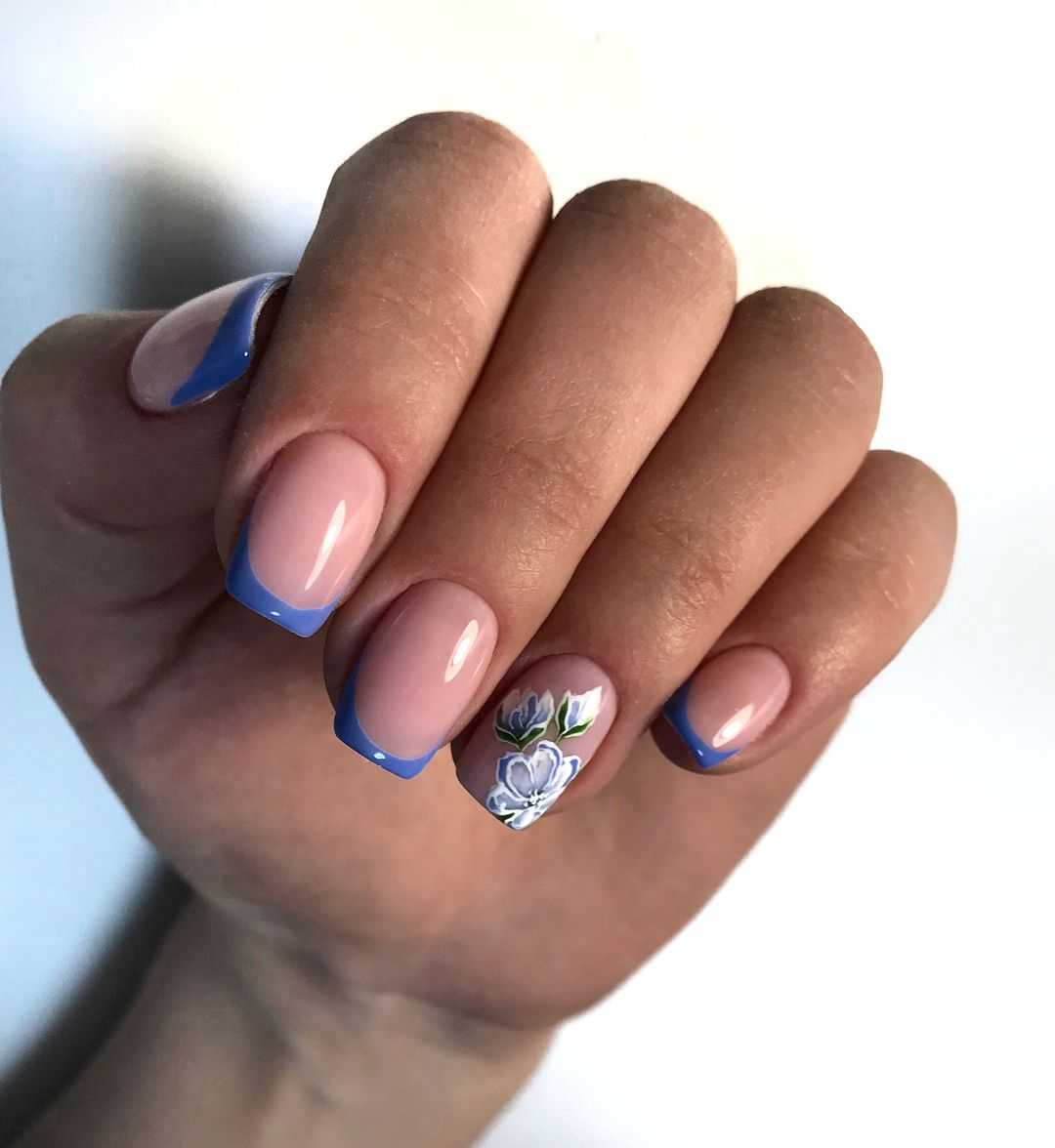 Нежный небесный тон для окантовки придаст ноготкам свежести. Для основы берут пастельные тона. Голубой маникюр френч 2022 подойдет для теплого сезона.