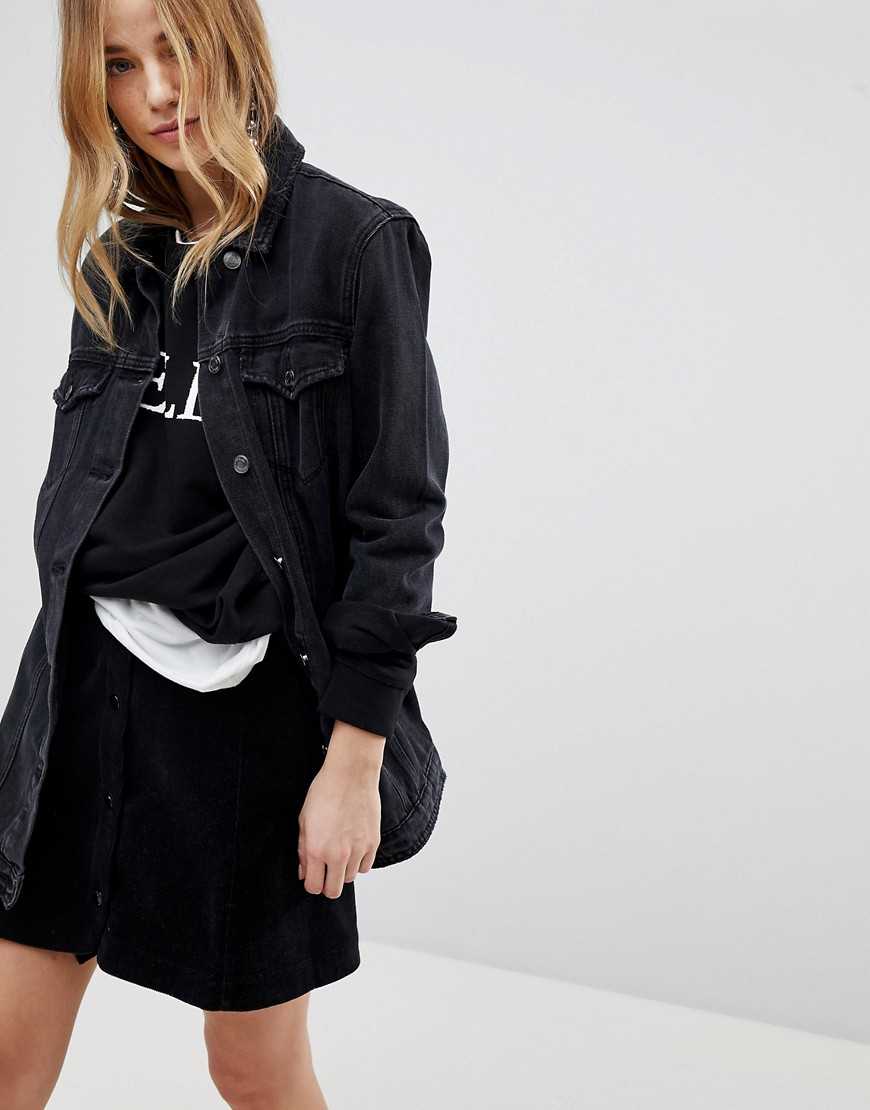С чем носить джинсовую куртку черного цвета? Стилисты предлагают создавать спортивные образы, к примеру, такие, как представлены на фото. Черная джинсовая куртка отлично дополнит толстовку, футболку или водолазку, а вниз надевайте любимые синие джинсы, скинни или узкие кожаные брюки. Красивый комплект получится, если надеть платье-рубашку или цветную футболку с принтом и юбку.