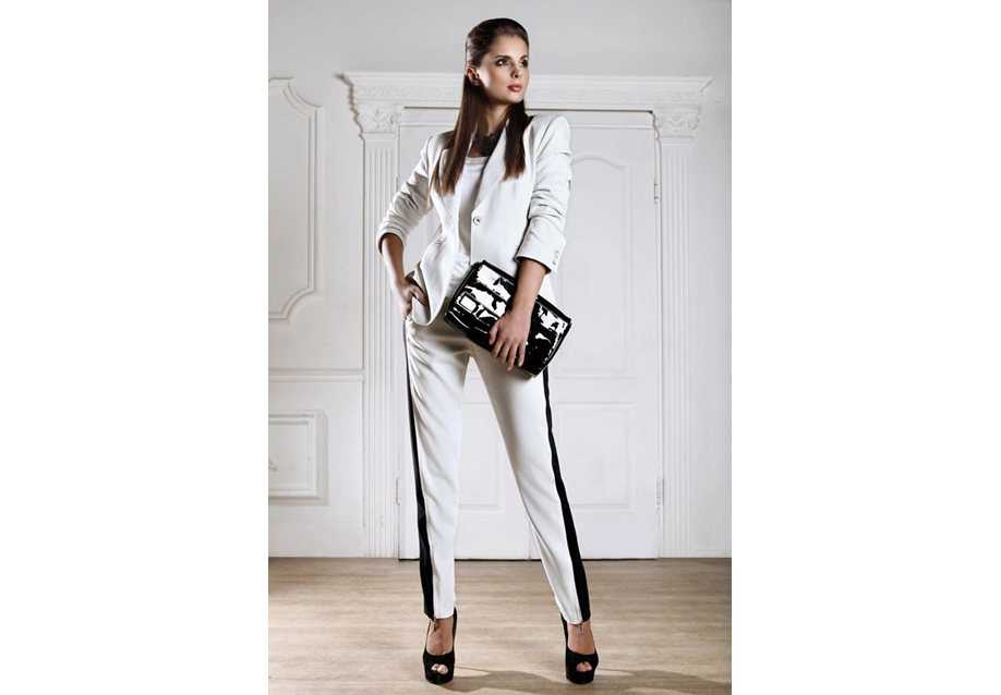 Допускается разная длина брюк – как очень длинные, так и укороченные, едва достигающие середины икры. Популярна не только классическая черно-белая палитра, но и цветные варианты с оттенками зеленого, фиолетового, алого, индиго и лимона.