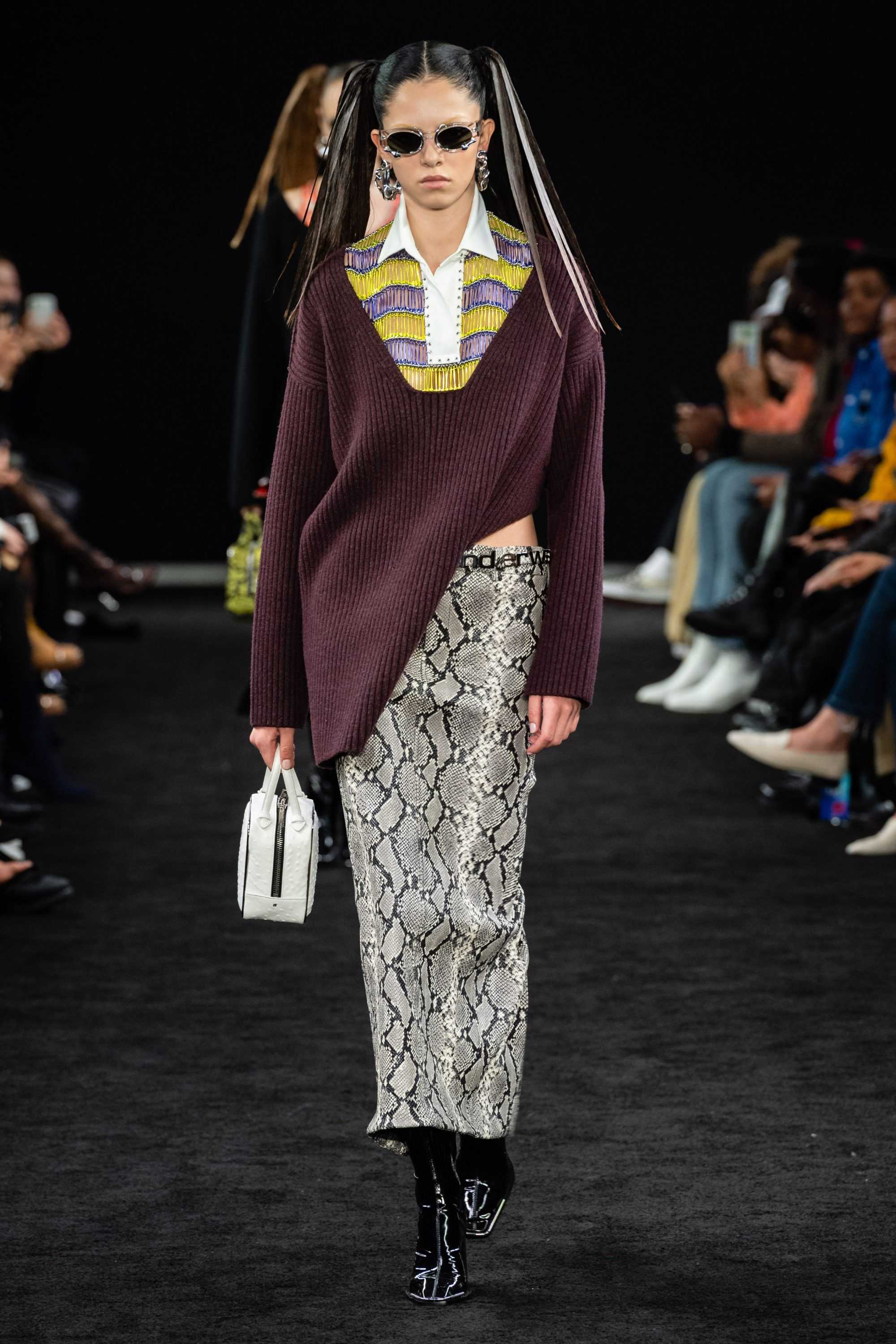 Модным дополнением осеннего гардероба может стать тренч из кожи питона. В образе из коллекции Elie Tahari он дополнен широким ремнем с не менее актуальным принтом.