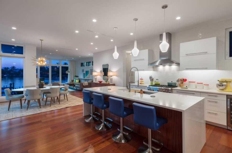 Всё зависит от вкусовых предпочтений хозяев помещения. Однако с развитием технологий и всеобщего внимания к натяжным или подвесным потолкам в дизайне помимо подвесных люстр активно используются встроенные точечные светильники или подсветка.