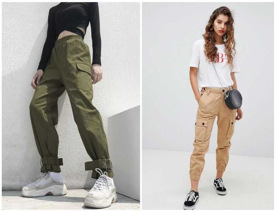 Штаны с накладными карманами характерны для стиля милитари. Чаще встречаются в цветах хаки или черном. Возьмите на заметку бананы с накладными карманами, если захотите добавить перчинку своему образу. К общему луку подберите пару грубых военных ботинок или кроссовки, внешне напоминающие мужские.