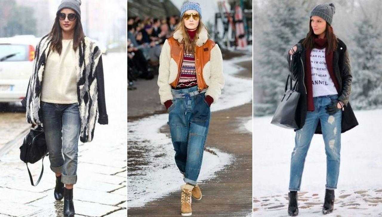 Зимние модели выполняются из плотного денима, часто с подкладкой. Объемные и бесформенные свитера в сочетании с «бананами» противопоказаны. Джинсы свободного силуэта носят с гольфами, джемперами, свитерами и свитшотами, заправленными внутрь. Рекомендуется также укороченная верхняя одежда – полушубок, кожаная куртка с мехом, короткая дубленка или утепленный бомбер.