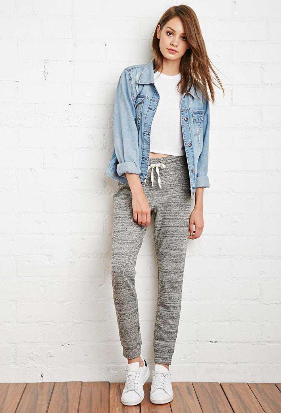 Сочетание джинсовки и джоггеров идеально впишется в концепцию стиля спорт-кэжуал. Такую комбинацию можно носить с кроссовками, ботинками, туфлями, что зависит от погоды и обстоятельств. Для прогулки летним вечером можно надеть брюки, сандалии или шлепанцы и джинсовку поверх топа, а для прогулок осенью – брюки, кроссовки, свитер и куртку.