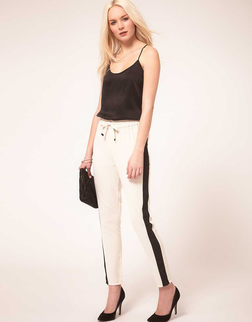 Черные спортивные универсальные брюки начинают уступать позиции более смелым белоснежно-синим, красно-белым моделям. Их носят с балетками, мокасинами.