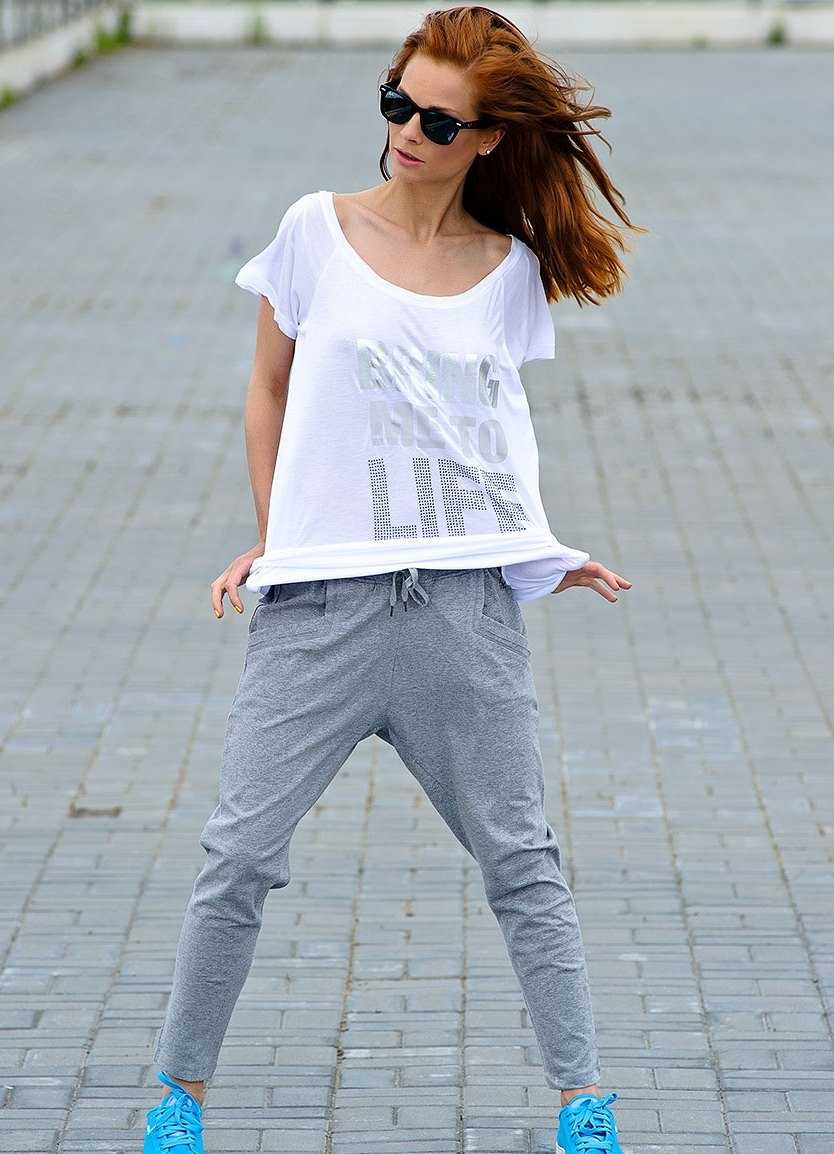Если предпочтение отдается активной, наполненной движением и спортом жизни, то используют уютные свободные трикотажные джоггеры. Они великолепны с футболками, толстовками, кроссовками, массивными ботинками.