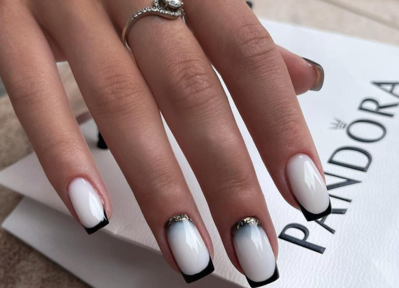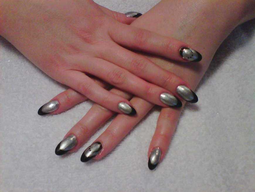 Нарядный вариант, при котором край ногтя украшается темным лаком и блестками, которые создают градиент с чистой ногтевой пластиной. Для стиля миллениум подходит лак стального, золотого или серебряного цвета.