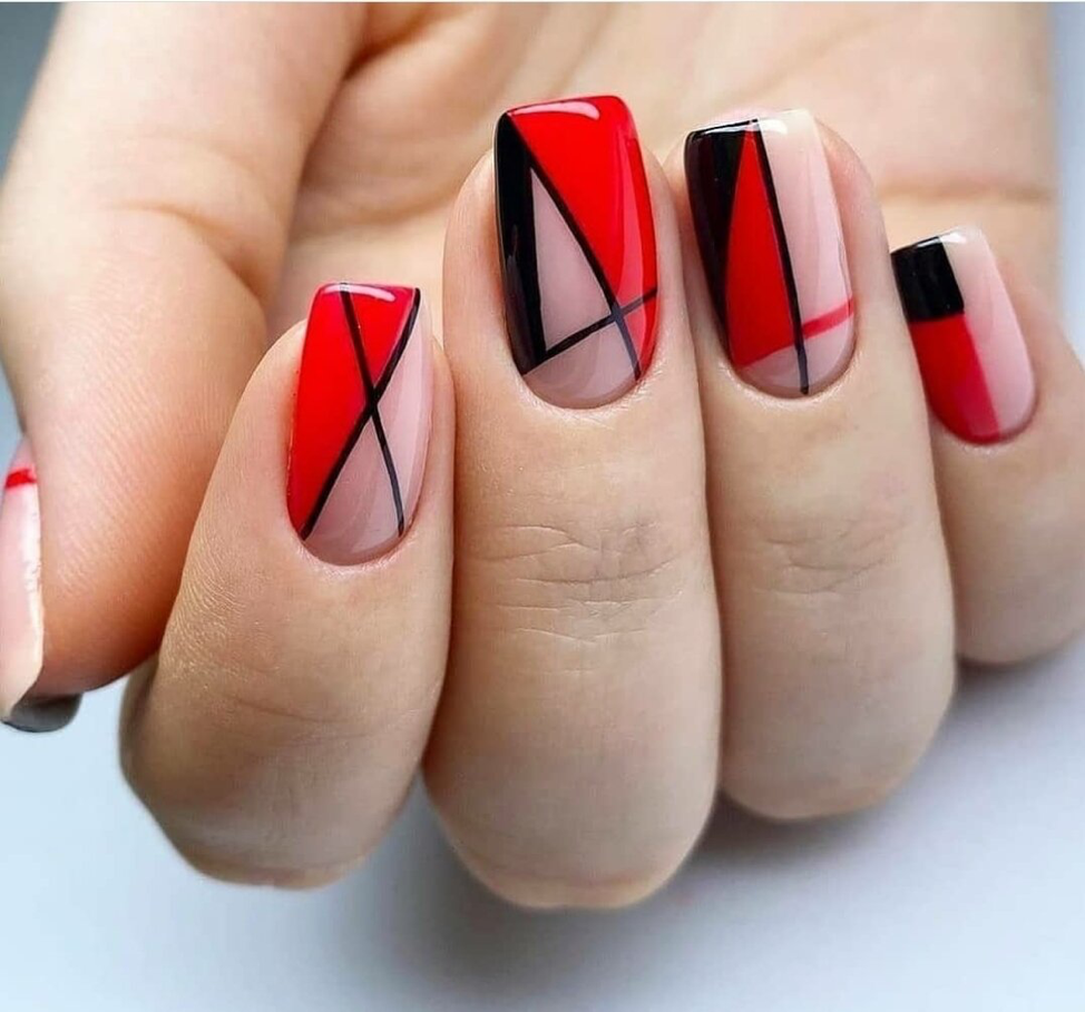 Красный цвет маникюра – это классика, которая будет модной в 2022 году. Применяя цвет, в технике геометрии красные оттенки идеально сочетать с белым, чёрным цветом. Чёрно-белый дуэт можно ассоциировать с абстракцией. Интересными формами дизайна станут геометрические узоры в сочетании с платьем, костюмом либо купальником.