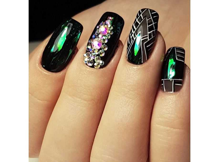 - “битое стекло” – благодаря применению фольги, голографических вставок и мерцающих наклеек удается создать “хрустальный” маникюр, очень нарядный и торжественный.
