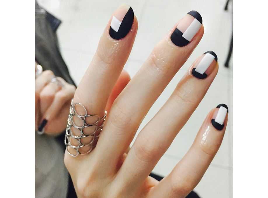 - negative space – частично покрытый лаком ноготок создает контрастный геометрический эффект природного цвета пластины и яркого лака;