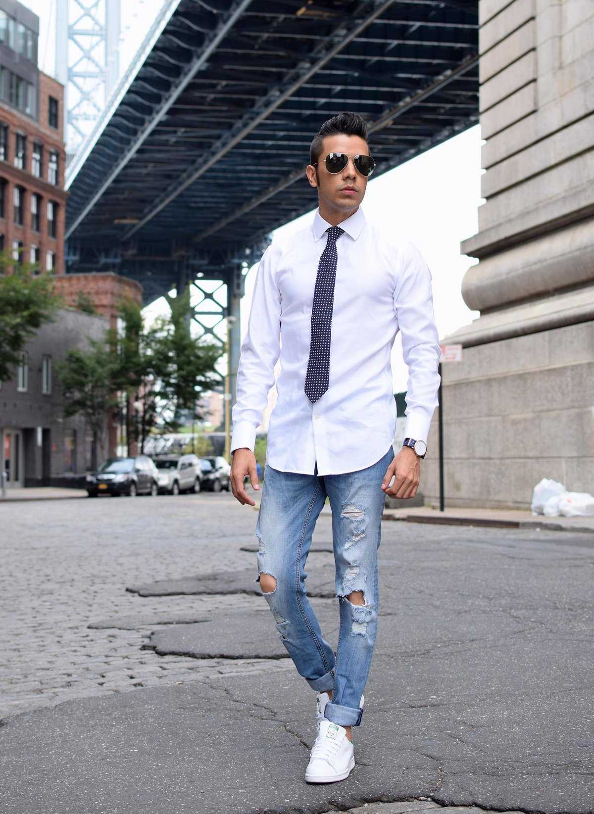 Джинсы темно-синего цвета, белая, приталенная рубашка белого цвета и топ-сайдеры. При этом сорочка может быть с коротким или подвернутым длинным рукавом, заправлена или выпущена наружу.