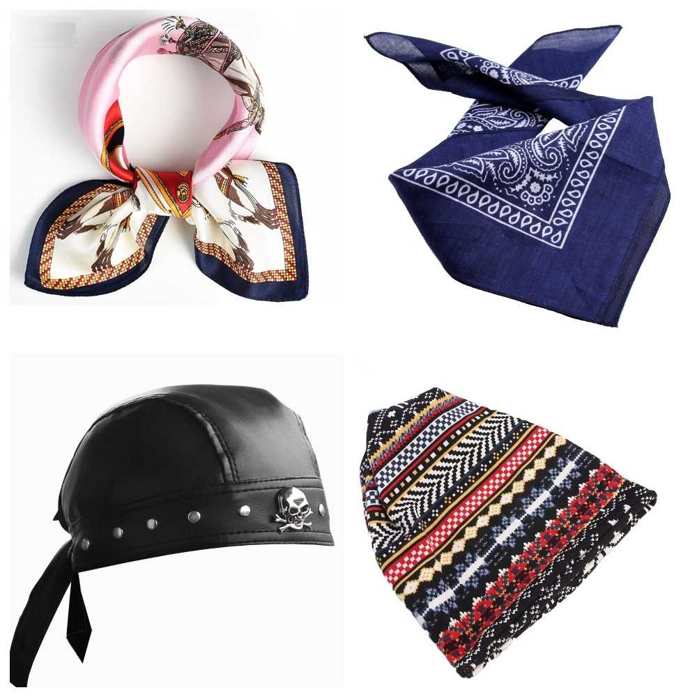 - Форма. Треугольные косынки легче всего повязать, квадратные – простые и удобные, прямоугольные относятся к стандартному типу, используются чаще других. В последнее время популярными стали банданы-баффы, выполняющие одновременно функцию платка, повязки на лицо и шарфа.