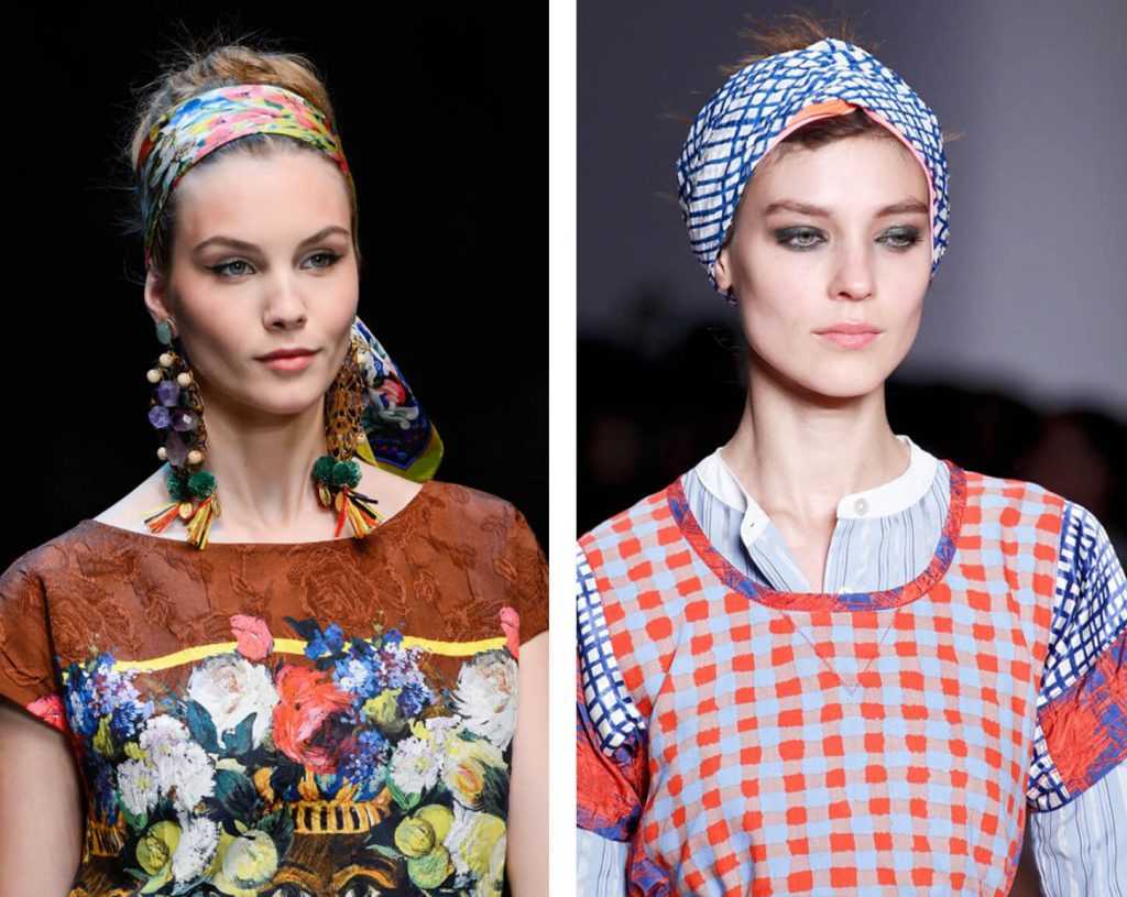 Дизайнеры бренда DAKS показали объемный тюрбан из серой ткани в клетку, напоминающей плед, а Miu Miu, Gucci и Pascal Millet порадовали публику простыми банданами: