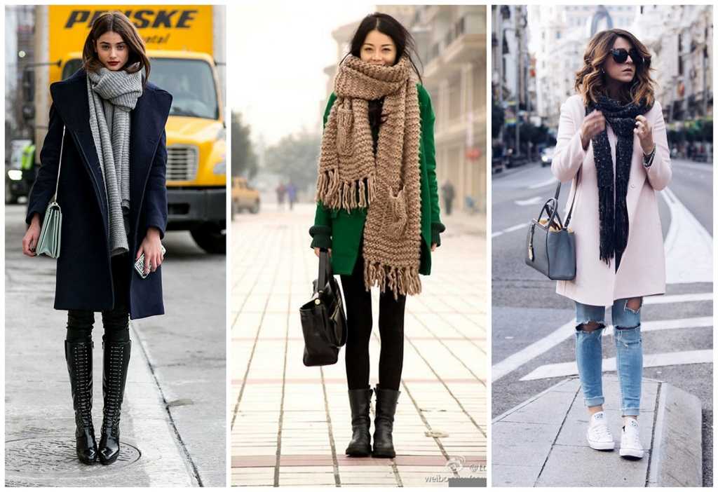 Для элегантных образов подбирайте широкие шарфы, либо красивые хомуты. Для повседневных можно позволить себе что угодно, в том числе и мега-длинные шарфы, которые носят, свернув кольцами.