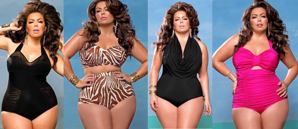 - В гардеробе пышечки вполне допустим и раздельный купальник. Но, конечно, не бикини. Подойдет моделька с высокими трусиками и широким плотным лифом. Снова привет из прошлого, особенно если выбор падет на расцветку в горох или с диагональными полосами.