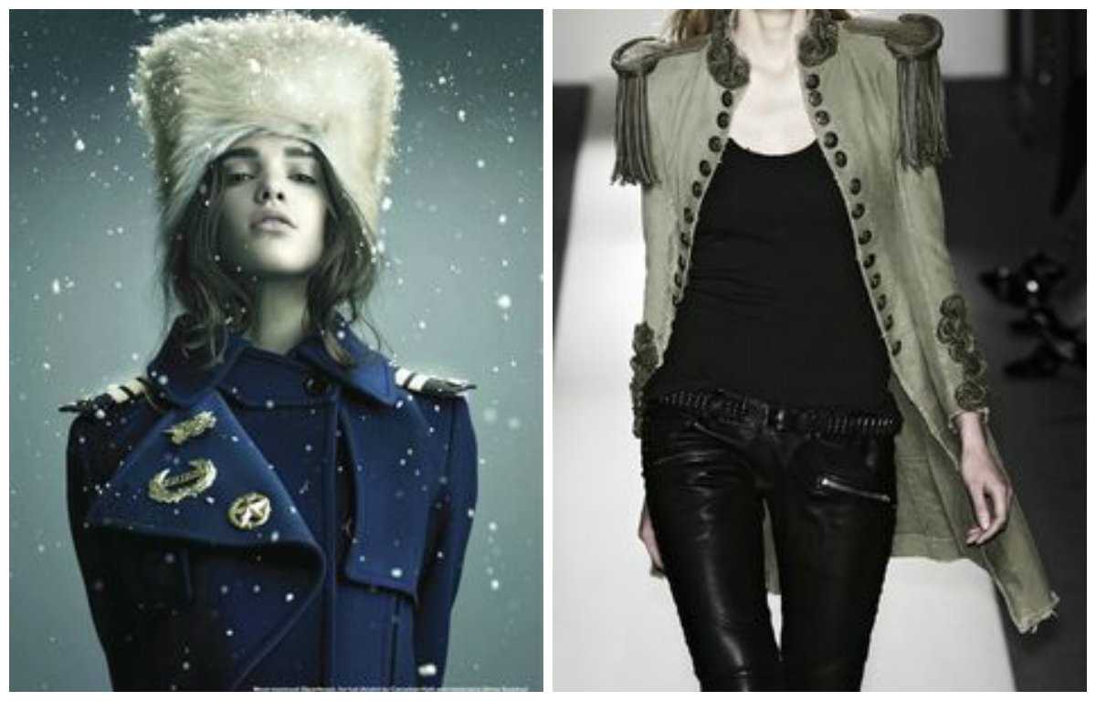 Пальто в стиле милитари. Оно может быть представлено двубортной шинелью, либо кителем. Основные отличия — пуговицы (напоминающие армейские), погоны, паты. Для образа используйте прямые темные брюки со стрелками. Подбирая юбку, следите, чтобы её длина была больше, чем длина верхней одежды. Не забудьте про аксессуары — перчатки, сумочку и стильный шарф.