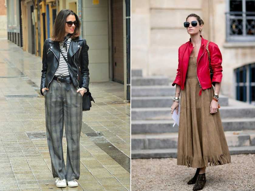 Кожаная куртка эффектно смотрится с юбкой-карандаш, сникерсами, рюкзаком либо лаконичной сумкой на длинном ремешке. Шапка бини и шерстяной бактус гармонично завершат аутфит. С юбкой длины миди, объемным худи и слипонами получится интересный вариант в стиле спортивный кэжуал. Не менее трендовая идея — сочетание свитера оверсайз, штанов с лампасами свободного кроя и кед.