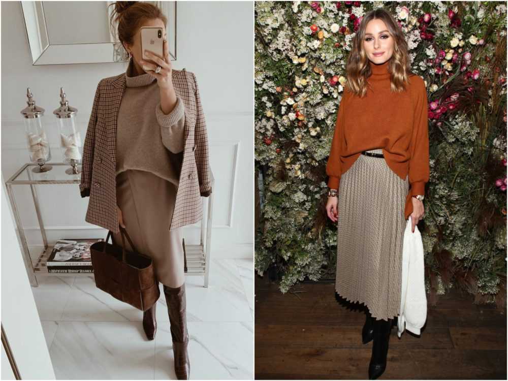 А вот сочетание юбки миди и высоких сапог, которые уходят прямо под юбку — очень удачное.