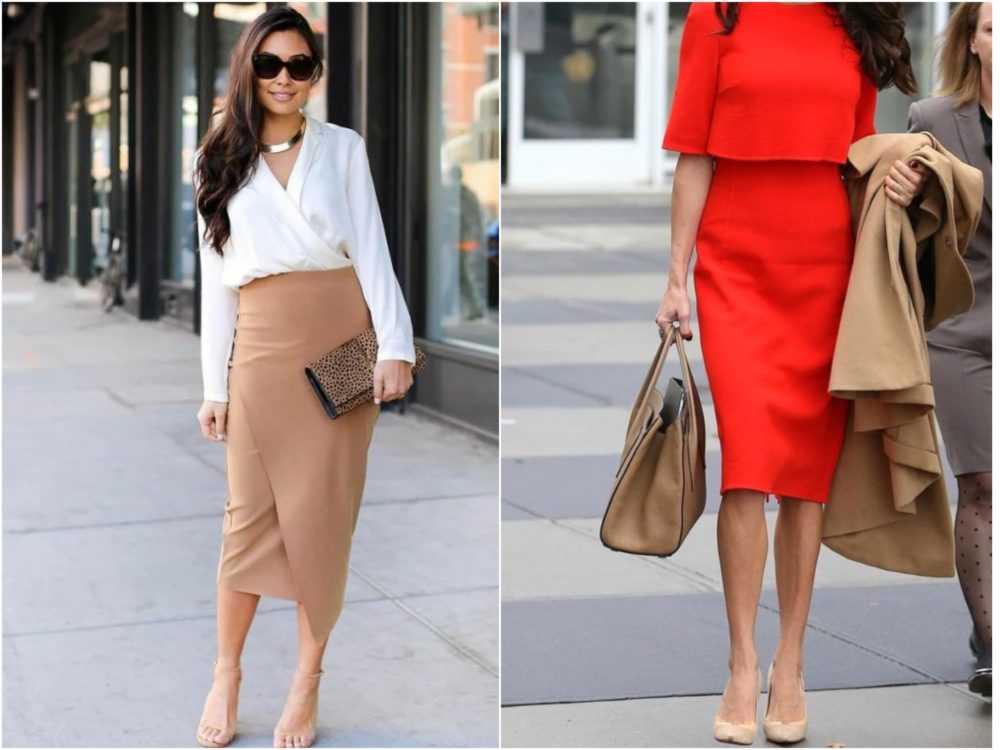 - Юбки-карандаши. Лучше, если они будут выполнены из ткани с плотной фактурой. Идеальный вариант – костюмная или джерси. Фасон – стандартный. Единственное условие — сзади должны быть две вытачки, талию желательно завысить.