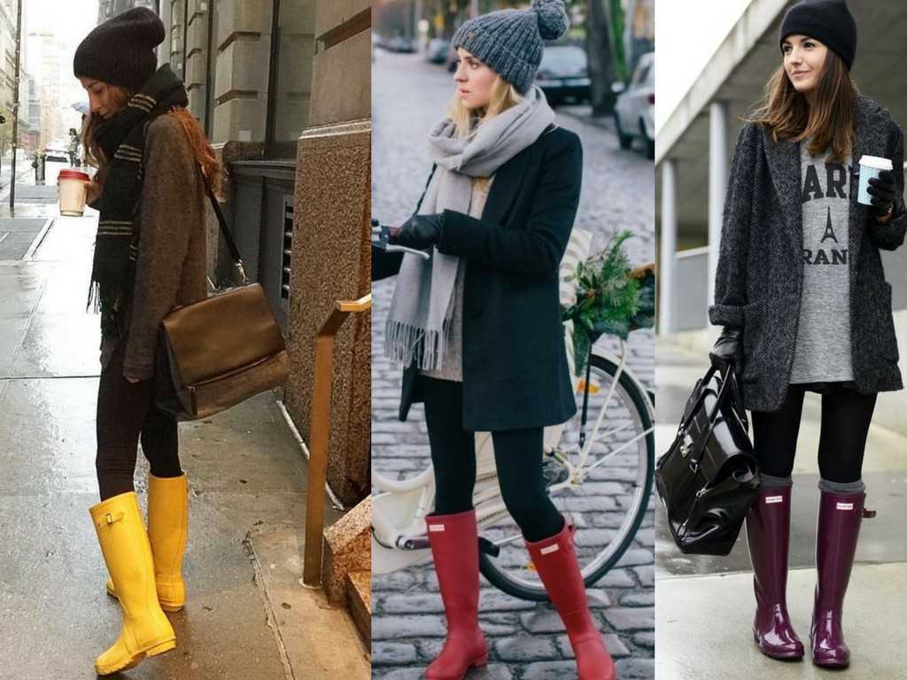 - резиновые сапоги. Что может быть лучше в дождливую погоду и грязь? Они могут выглядеть стильно и уместно. Расцветка может быть любой – от классических однотонных до ярких с принтом. В них можно заправлять брюки, джинсы, носить их под шорты и даже юбки;