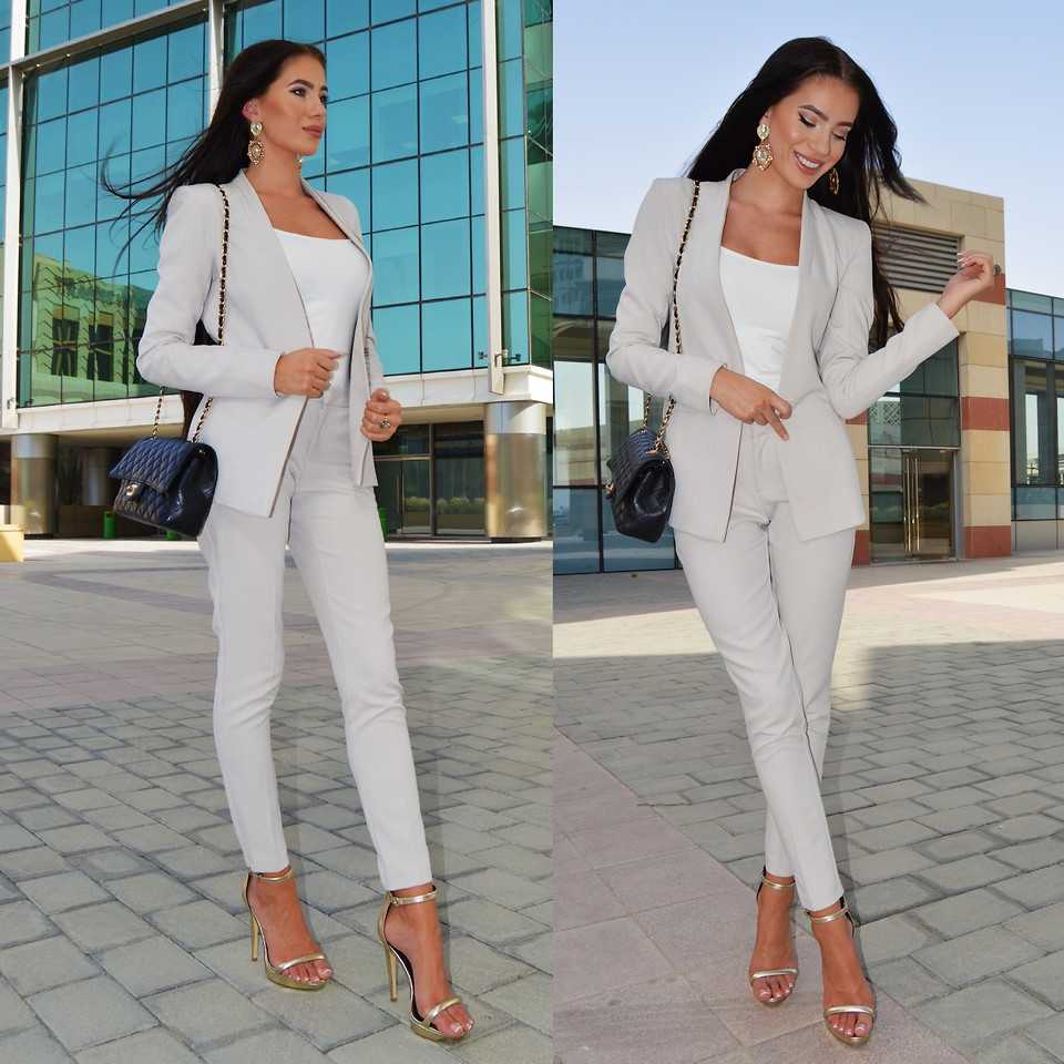 Брючный костюм бежевого цвета, такого же оттенка сумочка и туфли. Элегантность и сдержанность. И маленькая деталь — женственная кружевная блузка. Только не прозрачная! В деловом наряде не может быть и речи о том, чтобы сквозь одежду проглядывало белье!