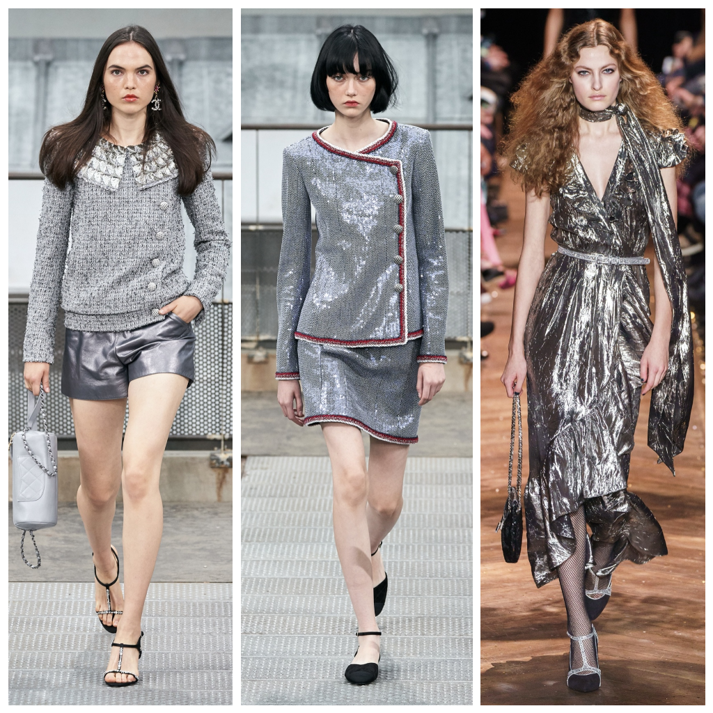 Чтобы такой образ не получился скучным, используйте разные оттенки серого, а для создания праздничного образа обратите внимание на актуальный цвет металлик с серебристым отливом