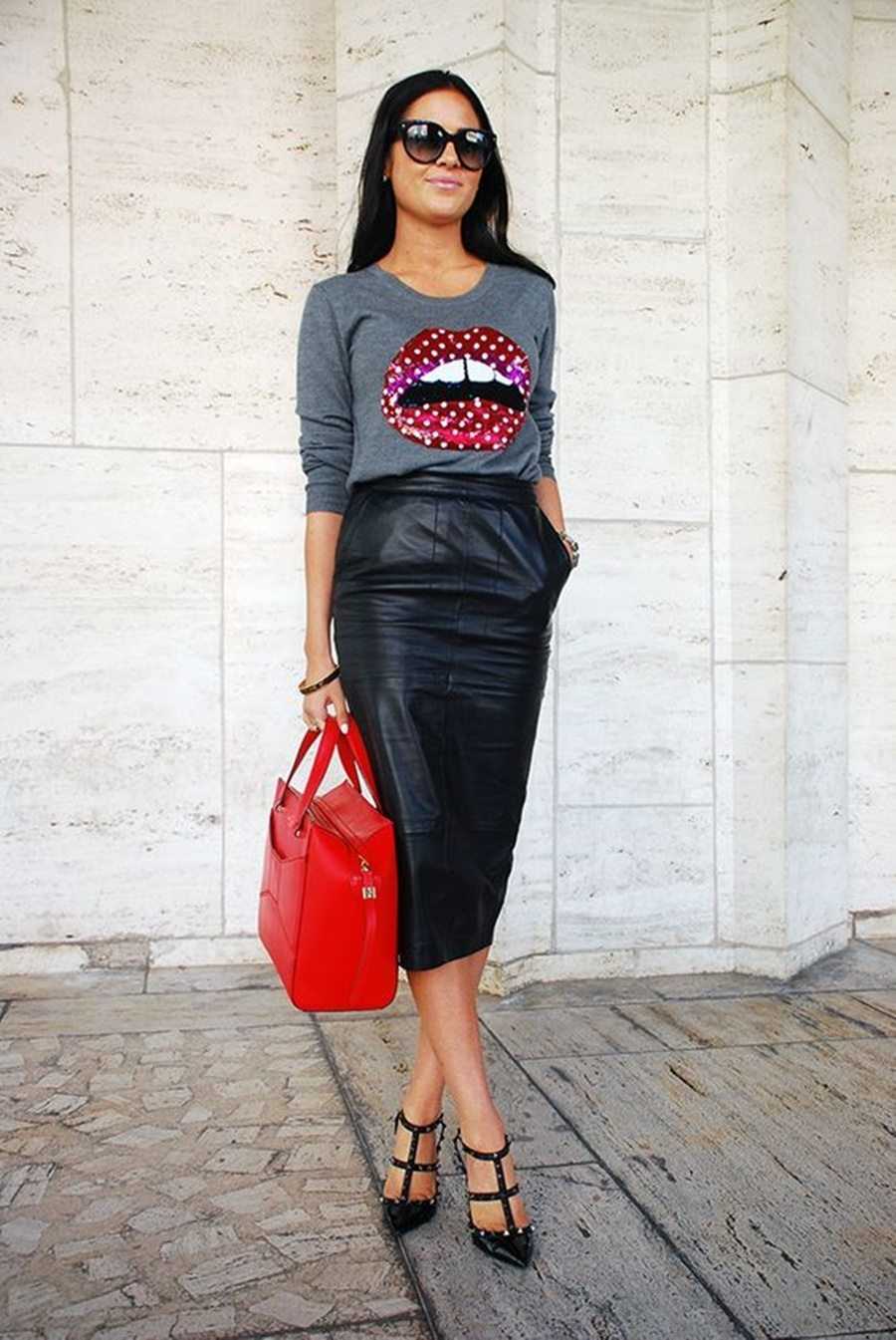 Красный цвет может идеально сочетаться с голубым, бежевым и черным верхом. Красная кожаная юбка вполне уместна для похода на вечеринку или в клуб.