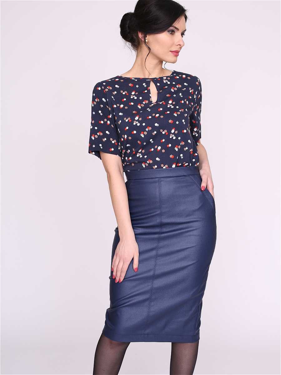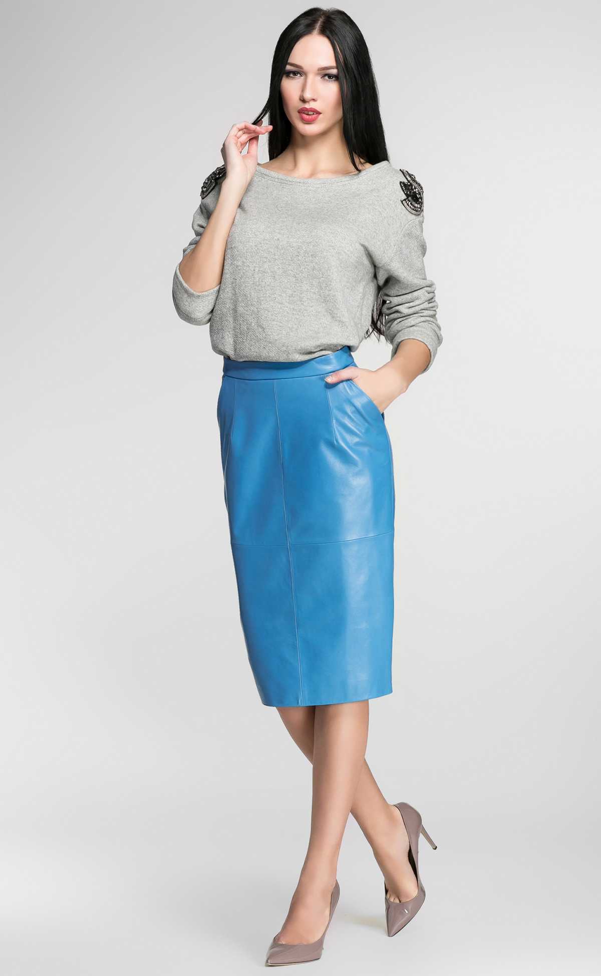 Голубая юбка из кожи — вполне нестандартное решение при выборе такого кожаного изделия. Она отлично смотрится с джинсовой рубашкой или блузой с цветочным принтом. Этот комплект придаст легкости и свежести созданному образу.