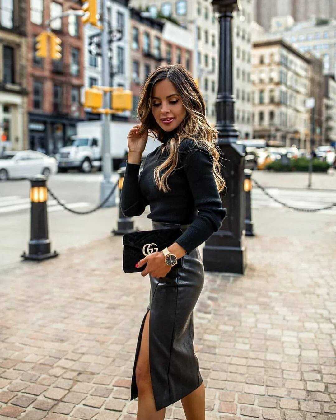Юбка-карандаш и водолазка. Такое сочетание смотрится очень женственно, ведь подчеркивает все достоинства фигуры. Низ при этом должен иметь высокую посадку, а водолазку нужно заправить внутрь. Обязательно используйте в качестве аксессуара стильный ремень. Если вы выбрали такой образ для офиса, его можно дополнить пиджаком. А если он тоже будет кожаным, то вы получите тотал лук.