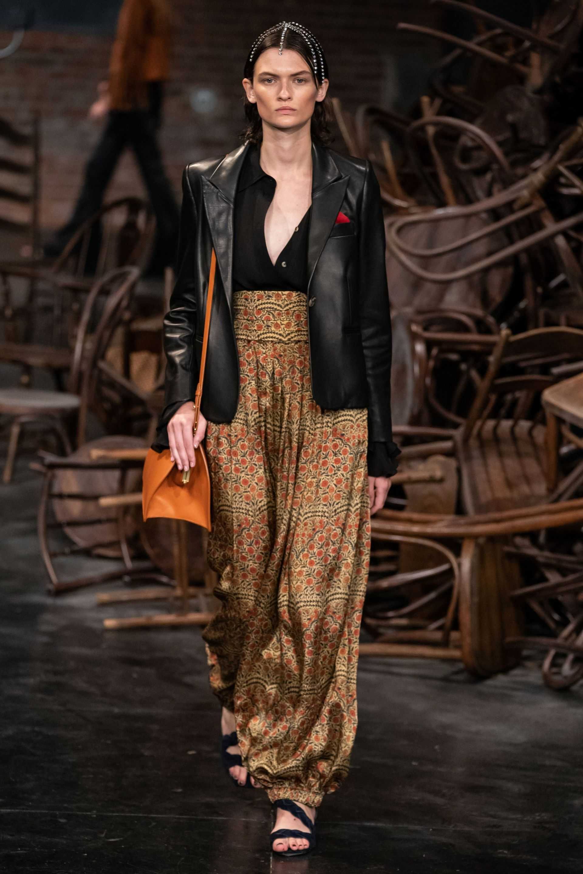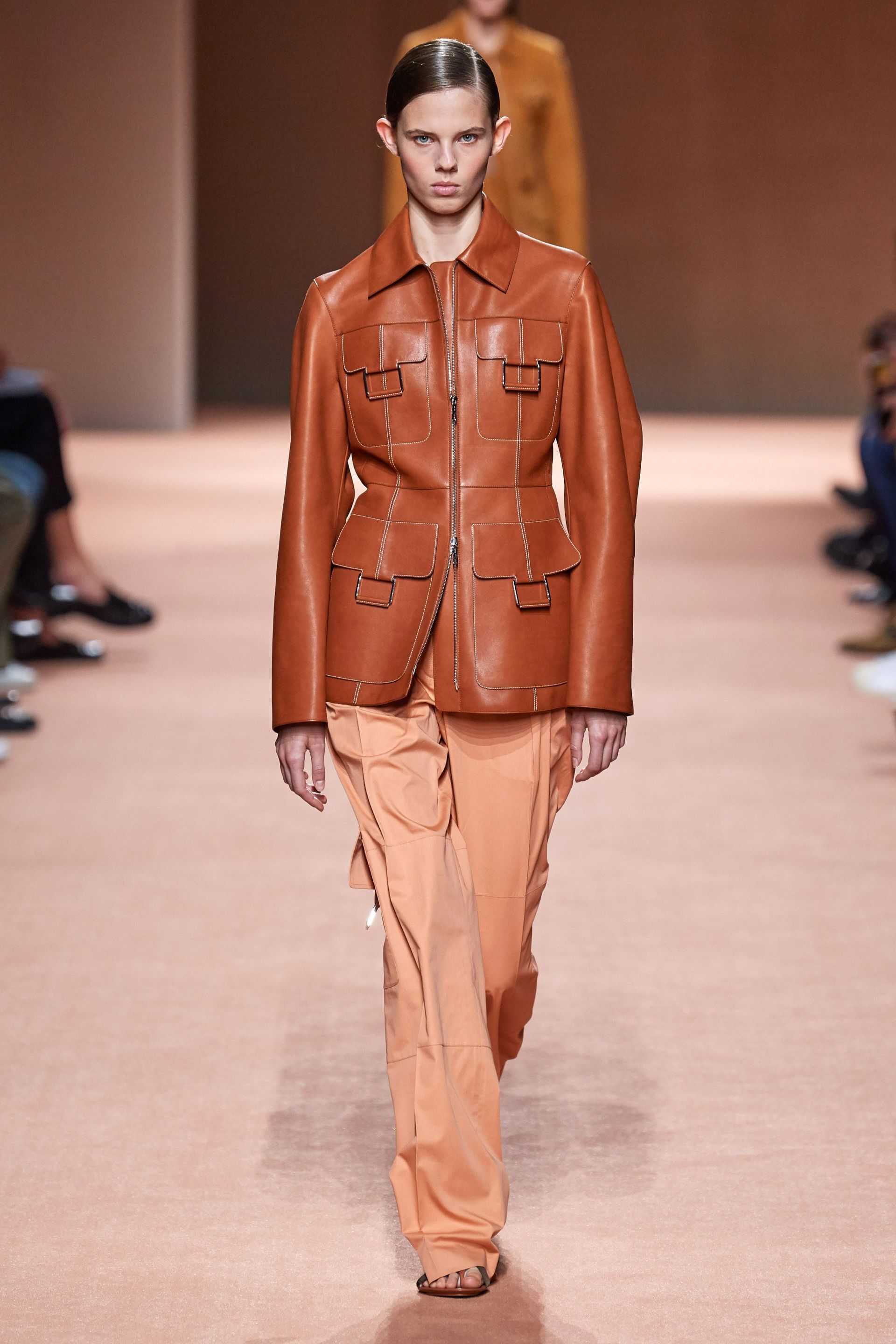 С чем женщинам стоит носить кожаный пиджак осенью 2020? Ну, разумеется, с брюками. Причем самого разнообразного фасона. Для офиса подберите лаконичные узкие модели без стрелок, которые подчеркнут ваш сдержанный деловой стиль. Для прогулок по городу или встреч с подругами подойдут брюки широкого кроя из неплотной материи. При желании, кожаный пиджак можно совместить даже с классическим низом, как было продемонстрировано на показе модным домом Hermès.