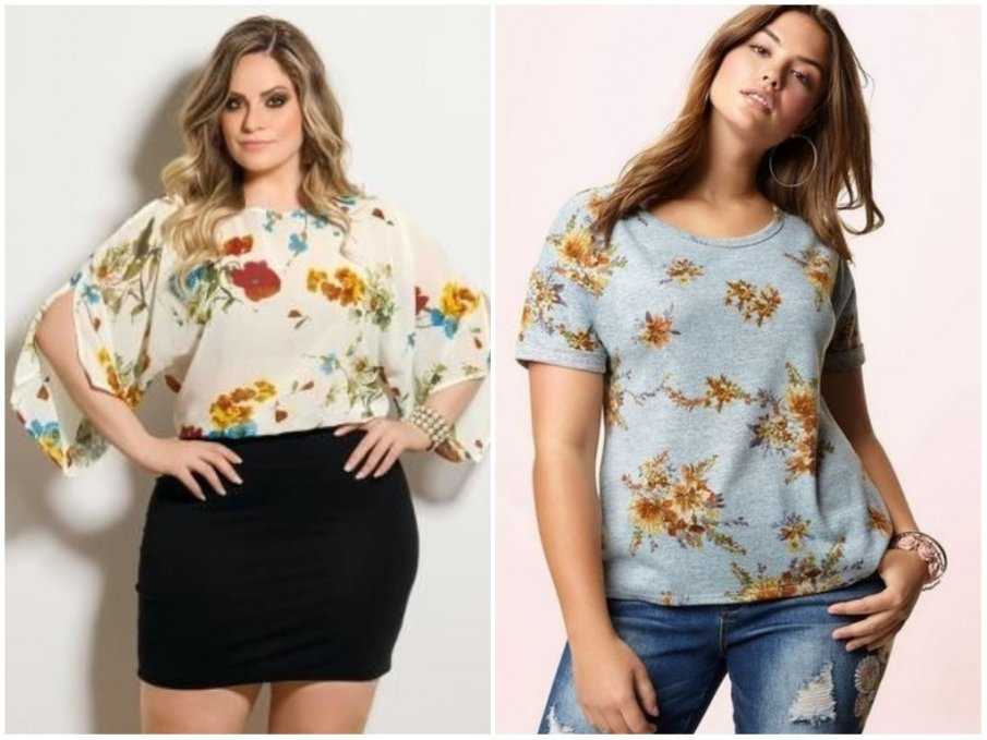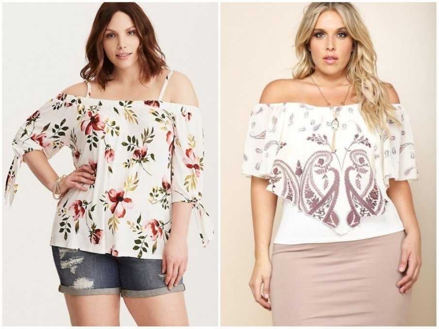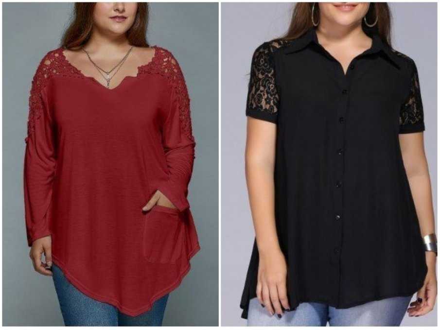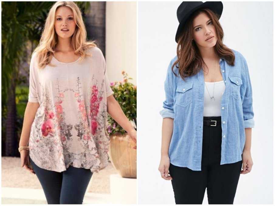 •	фонарные сорочки – неординарный вид свободной разлетайки, представленный в основном шифоновыми тканями с цветочными принтами. Отличается такой фасон расклешённостью рукава от плеча до кисти, напоминая тем самым нечто вроде фонарика, и заканчиваясь охватом манжета в виде резинки; •	полосатые рубахи с широкими лацканами ворота – плотным девушкам особенно подходят различные одеяния с вертикальной полосой; не исключением является и чёрно-белая полосатая рубашка с вертикальными широкими линиями, которая визуально стройнит фигуру своей пышной обладательницы;•	блуза с баской – великолепный тренд, который подходит не только худышкам, но и отлично скрывает мелкие недостатки в виде животика и боков дам с излишним весом за счёт уникальности дополнения блузки в виде баски.
