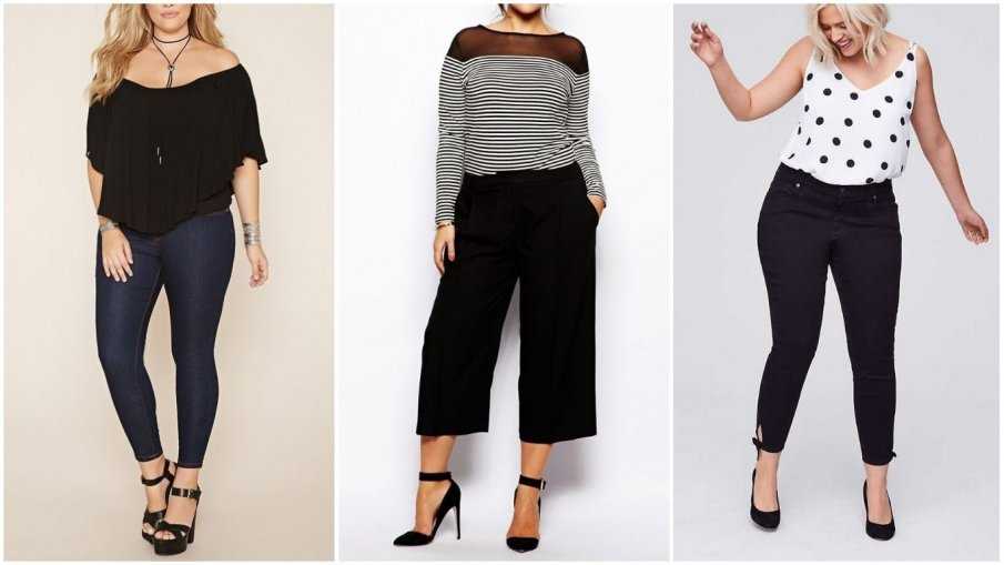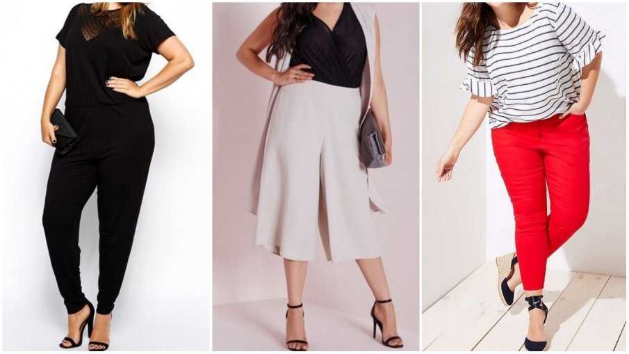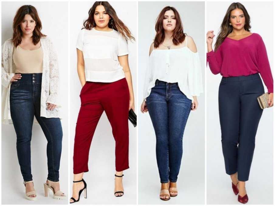 •	брюки-трубы – очень модные в текущем сезоне, такие штаны с завышенной талией и расклешённым от неё кроем визуально удлиняют рост крупной девушки, балансируя тем самым пропорциональность между ростом и весом своей обладательницы; очень модные цвета алый, чёрный, марсаловый, изумрудный лишь подчёркивают невероятную привлекательность такого рода брюк;•	классические штаны с косыми карманами и стрелками – всегда остающаяся на плаву классика в своей незабвенной элегантной манере подходит как стройным худышкам, так и упитанным округлым девушкам. Уместно в подборе классических брюк выбирать именно крой со стрелками – он визуально стройнит и удлиняет ногу своей владелицы, а косые карманы придают фасону некой вальяжности. Наиболее удачными цветами здесь считается беж, пыльный серый, глубокий графит, угольно-чёрный;•	утягивающие коттоновые джинсы – многие считают, что леди с округлыми формами не должны носить обтягивающих вещей, но это утверждение можно оспорить. Правильно подобранный под фигуру фасон завышенных обтягивающих джинсов в тёмной стройнящей расцветке и в композиции со свободного покроя кофтой навыпуск, прикрывающей наполовину ягодичную зону, отлично будет смотреться в дополнении с туфлями-лодочками.