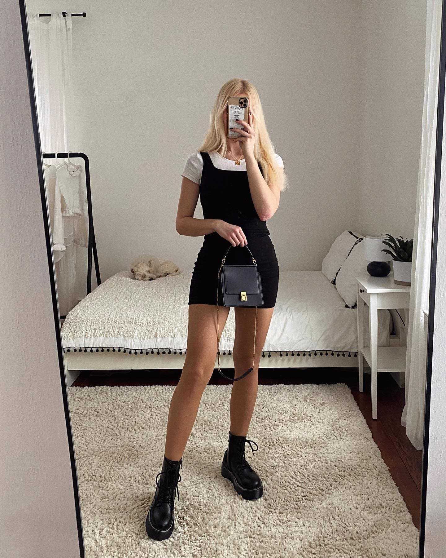 Что касается платьев, то в моде А-силуэт, трикотажные платья-футляры, укороченные модели с расклешенной юбкой, модели миди с юбкой колокол. В любом из них стильная модница будет чувствовать себя комфортно. Образ с юбкой или платьем можно органично дополнить высокими ботинками на грубой подошве, массивными кедами и кроссовками, сапогами на каблуке.