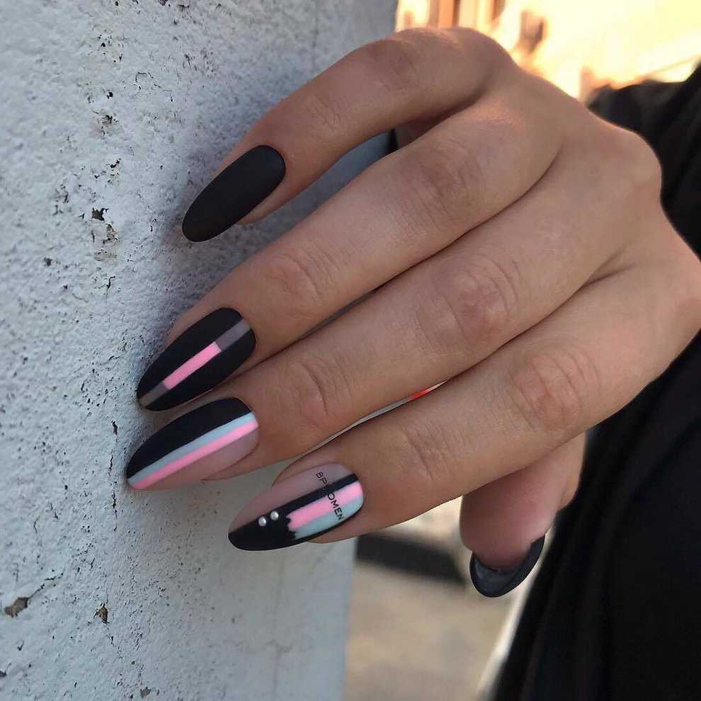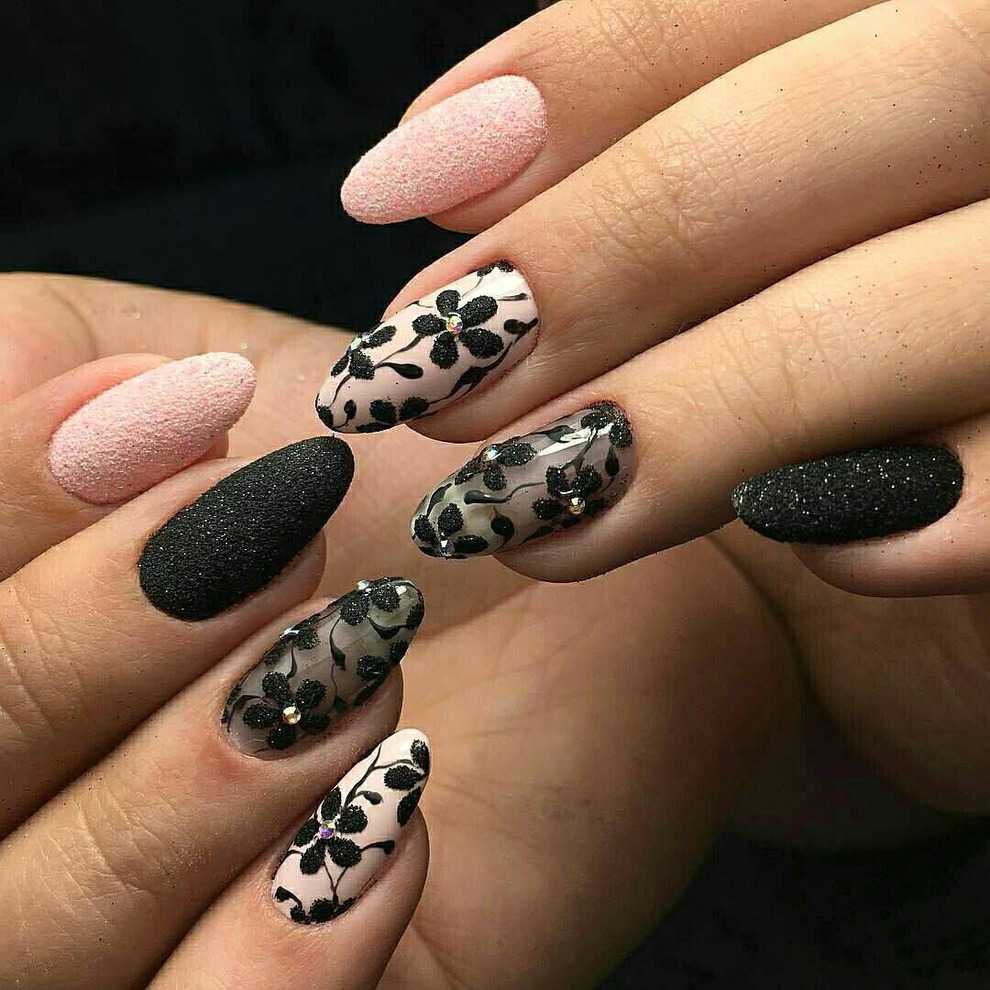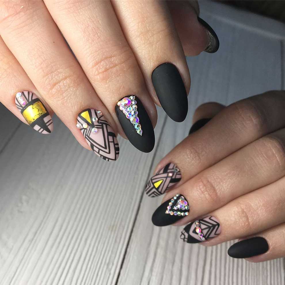 В новом сезоне забудьте о «классическом» черном. Новая модная идея – матовый черный дополняется ярким дизайном, например, стразами, фольгой или контрастным рисунком. Это разбавит строгость черного матового и сделает маникюр эффектным и точно нескучным.