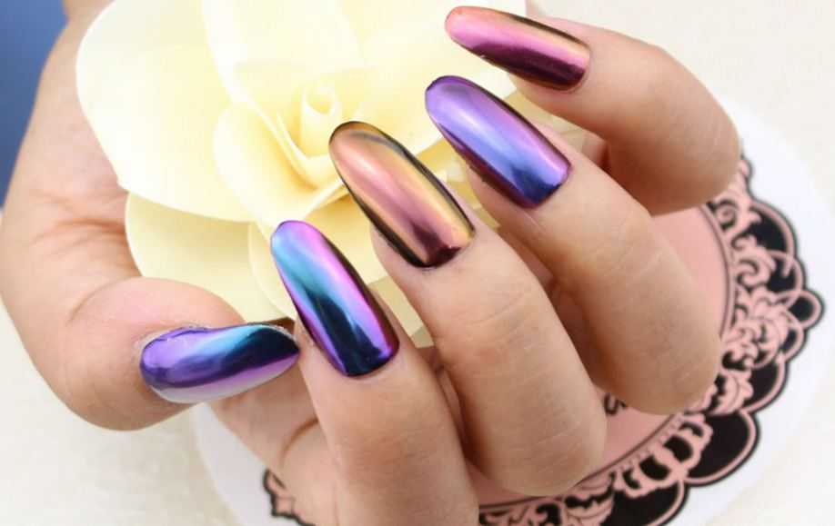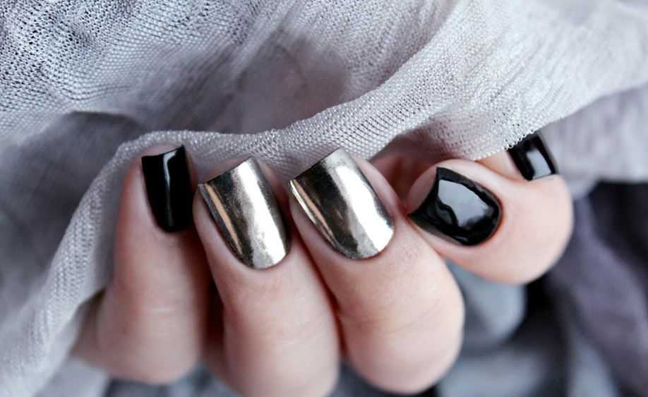 Chrome-nails – новейшая тенденция в стиле зеркального покрытия ногтей. Металлизированного эффекта удается добиться при помощи специальных лаков, разнообразных наклеек и фольгированных элементов. Но эффектнее всего смотрится дисперсионная хромированная пигментация в виде втирки, отлично сочетающейся с гелевым покрытием. В тандеме с гель-лаком металлизированное покрытие обещает быть очень стойким – до трех недель аккуратного стильного маникюра.