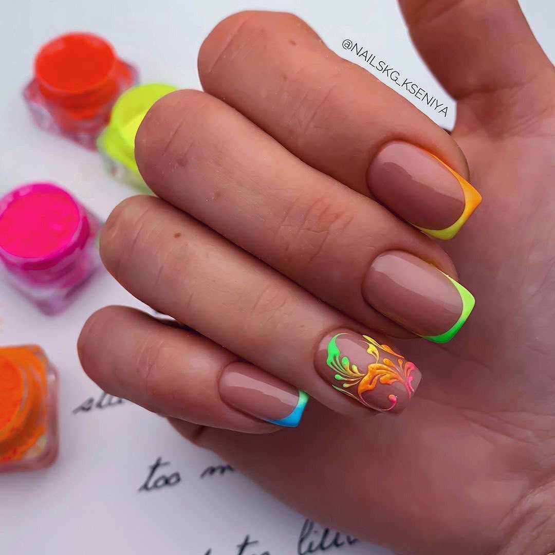 Такой маникюр можно выполнить в нейтральных или наоборот ярких тонах. Особенно интересно он смотрится в неоне (этот цвет, кстати, сейчас в тренде).