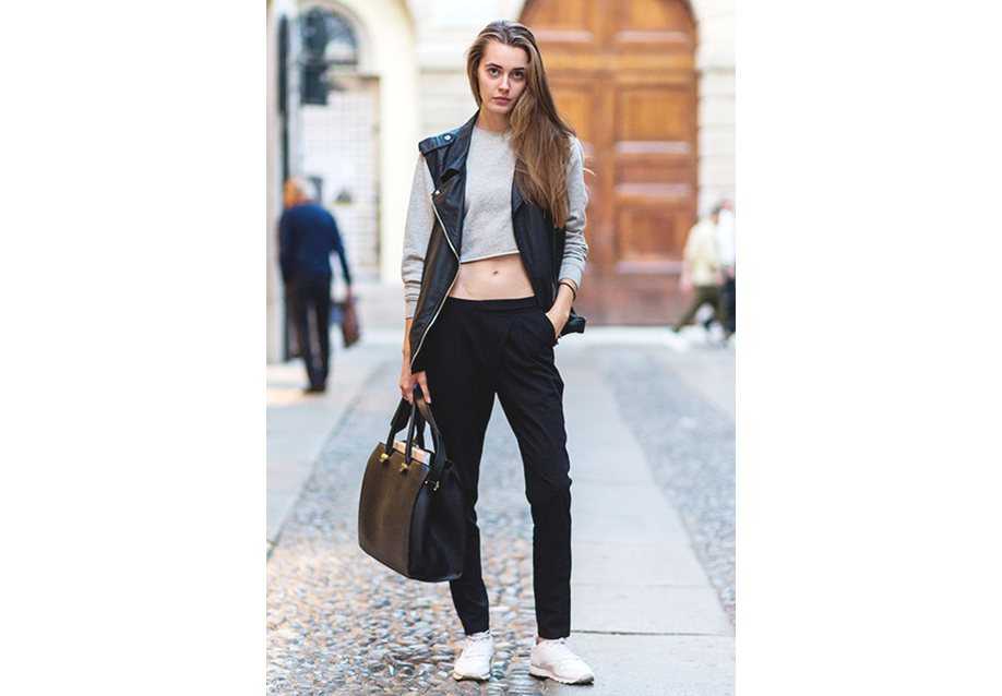 Универсальный ансамбль составят брюки в спорт-стиле, дополненные жилетом, объемным свитером, пуловером и белыми кроссовками.
