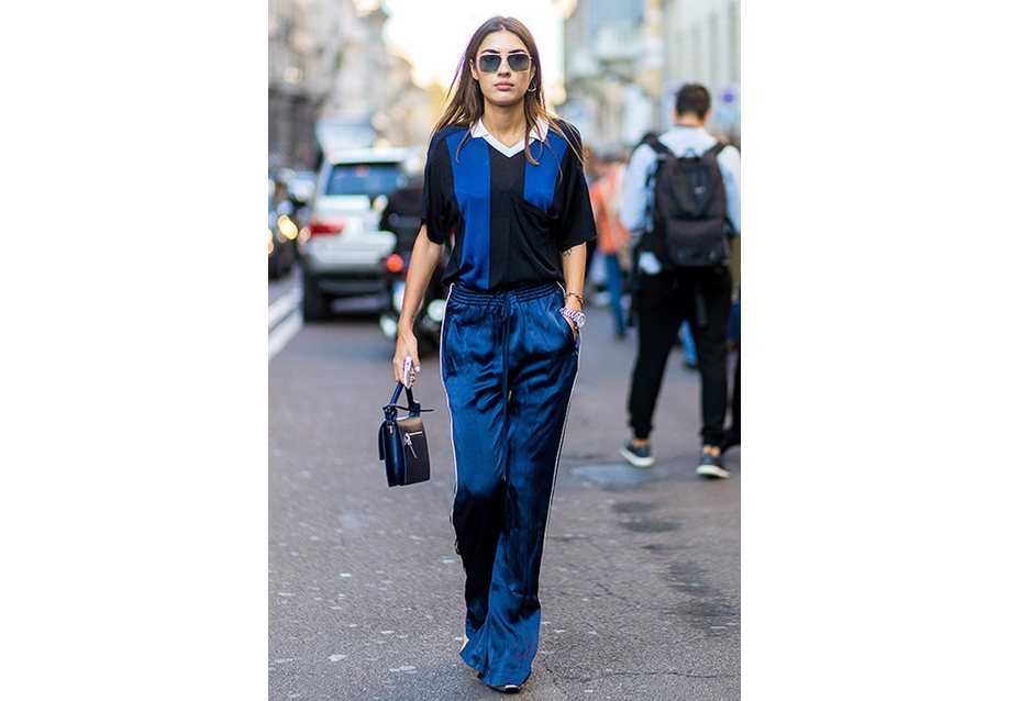 Эпатажным личностям стилисты предлагают еще более смелый вариант – синие спортивные штаны из шелка с выразительным блеском. Особенно хорош такой наряд будет для лета – солнечные лучи позволят сделать ткань игривой и переливающейся.