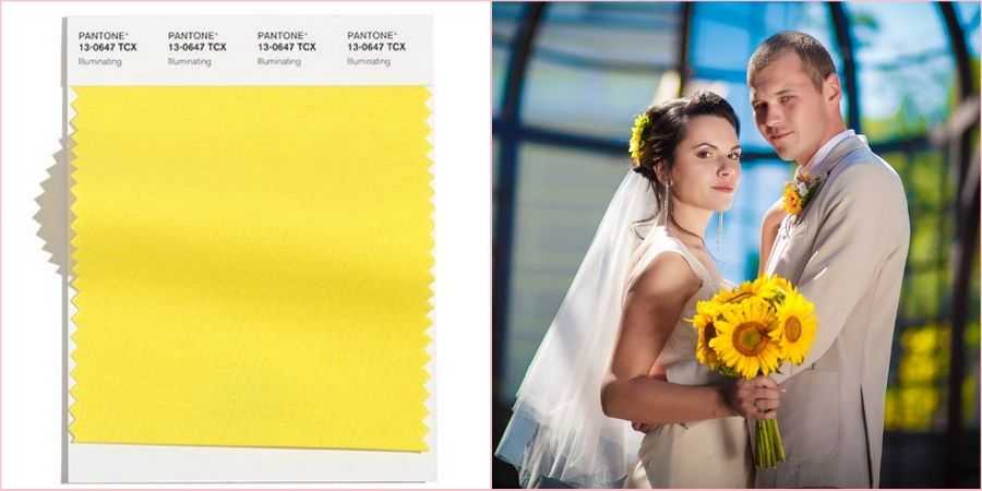 Вторым в списке модных идет цвет года 2021 – радостный, сочный, позитивный, дружелюбный желтый оттенок. Он замечательно будет смотреться на осенней свадьбе и напомнит всем солнечное лето.